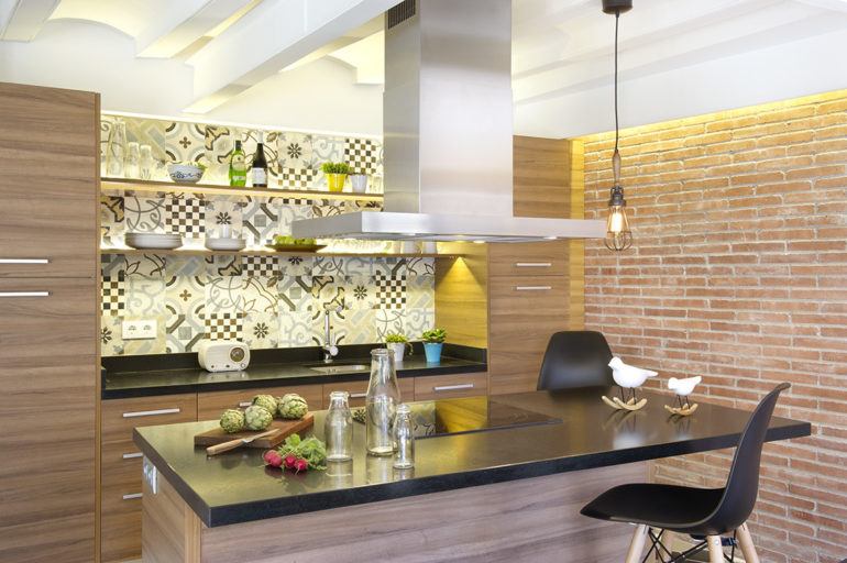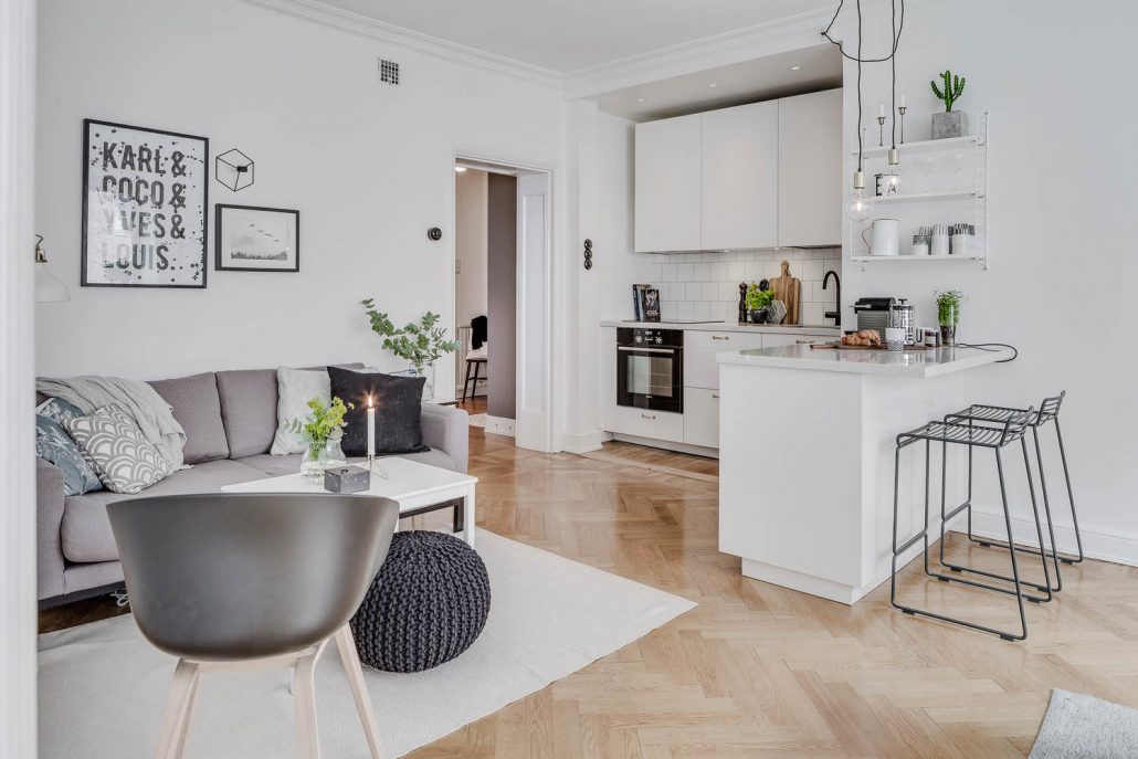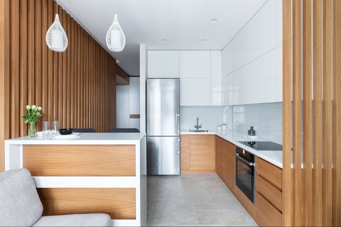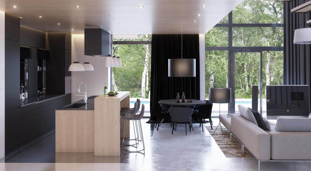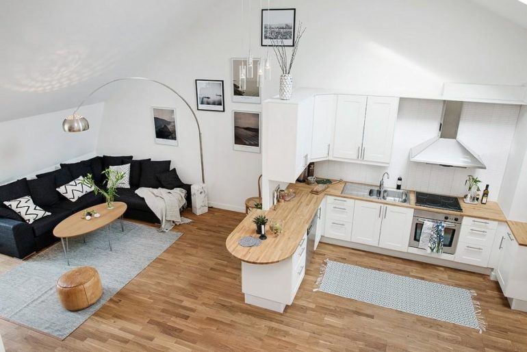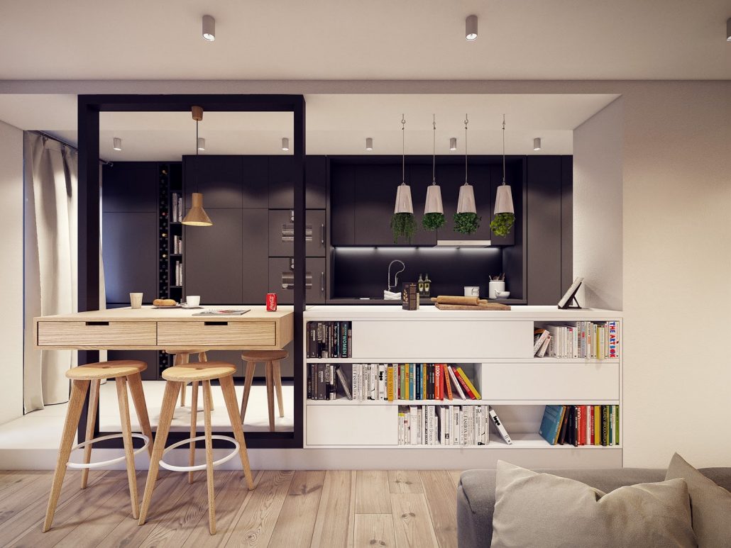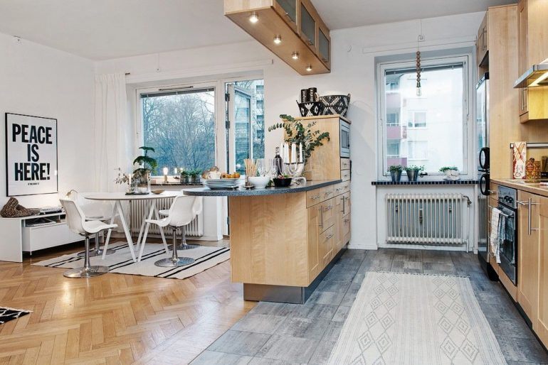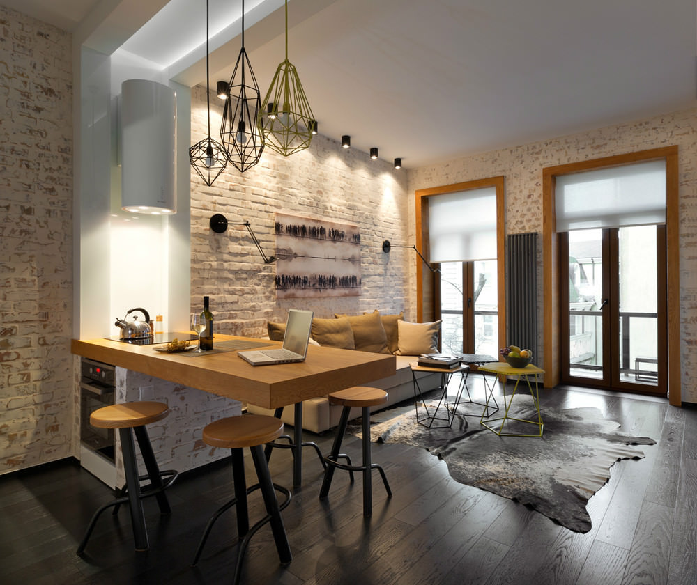 Cette direction de la décoration intérieure allie confort et fonctionnalité. À la jonction de la cuisine et du salon, vous pouvez placer un grand comptoir de bar en bois. Ainsi, il ne sera pas seulement diviser l’espace, mais aussi créer un lieu supplémentaire pour cuisiner et manger.