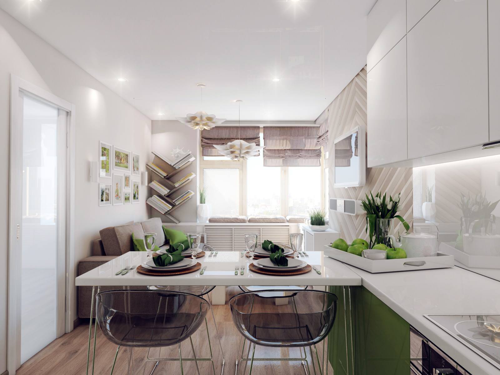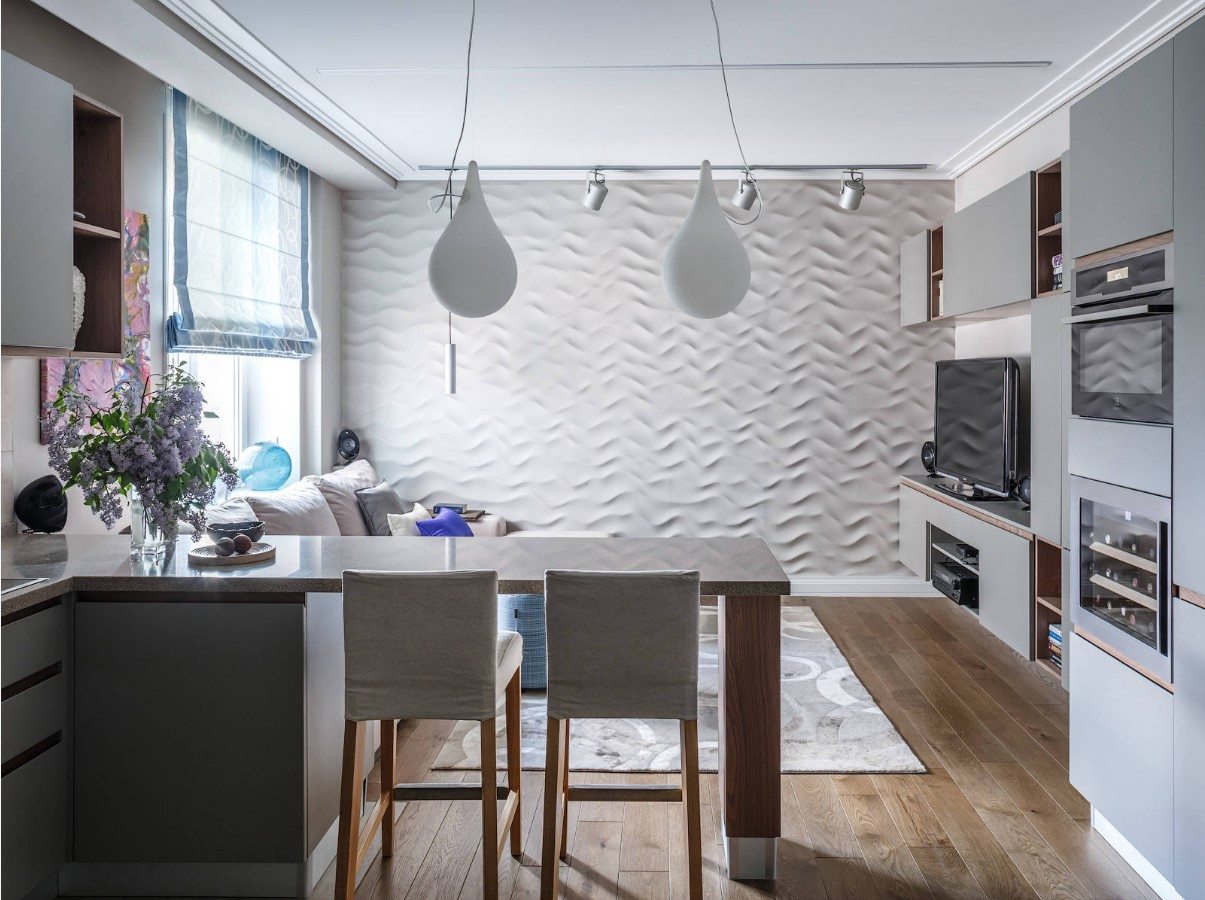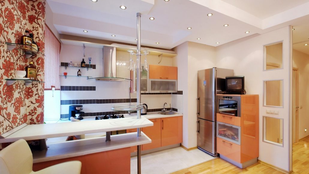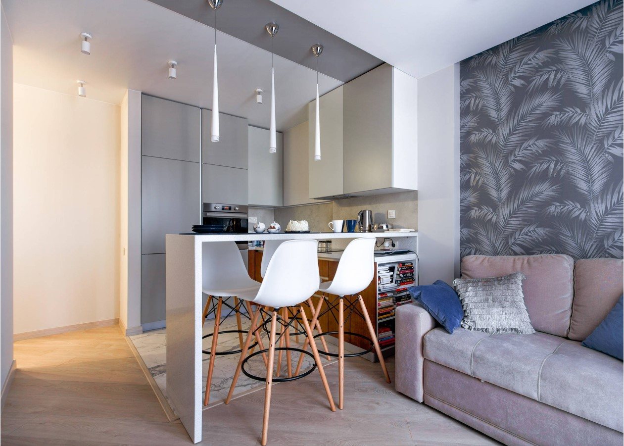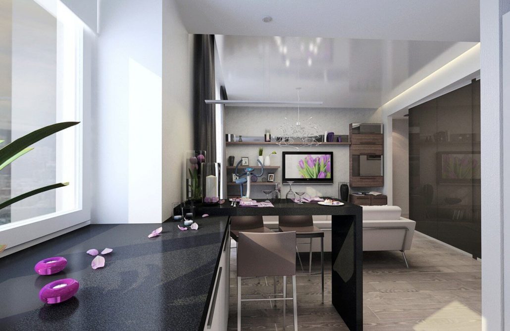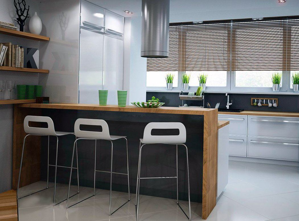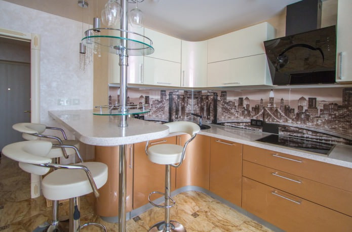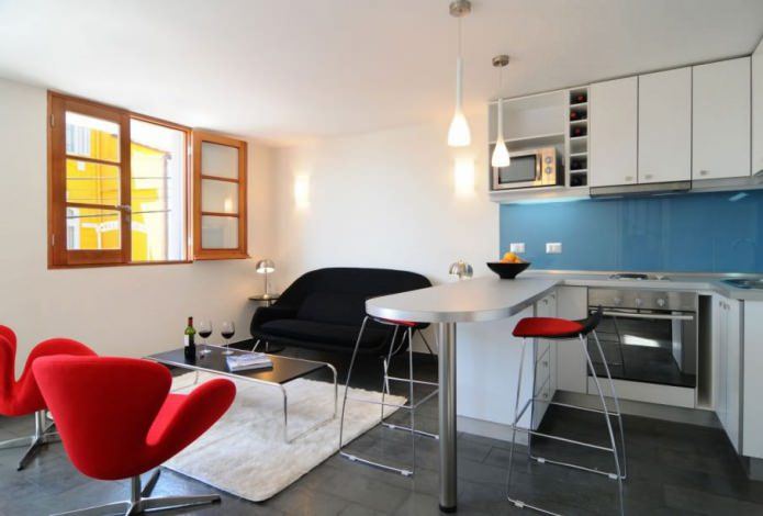 À première vue, la cuisine est de taille modeste, le comptoir de bar sera inapproprié. Cependant, c'est loin d'être le cas, en particulier pour les petites familles.Dans ce cas, il peut être remplacé par une table à manger ou utilisé pour prendre un verre avec des amis.