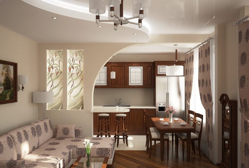 Cependant, il convient de prendre en compte certains inconvénients de cette conception. D'une manière ou d'une autre, les odeurs des aliments en cours de préparation tomberont dans le salon. A partir de là, la pièce deviendra plus polluée. Toutefois, ceci peut être évité en installant une hotte de grande qualité à proximité de la table de cuisson.