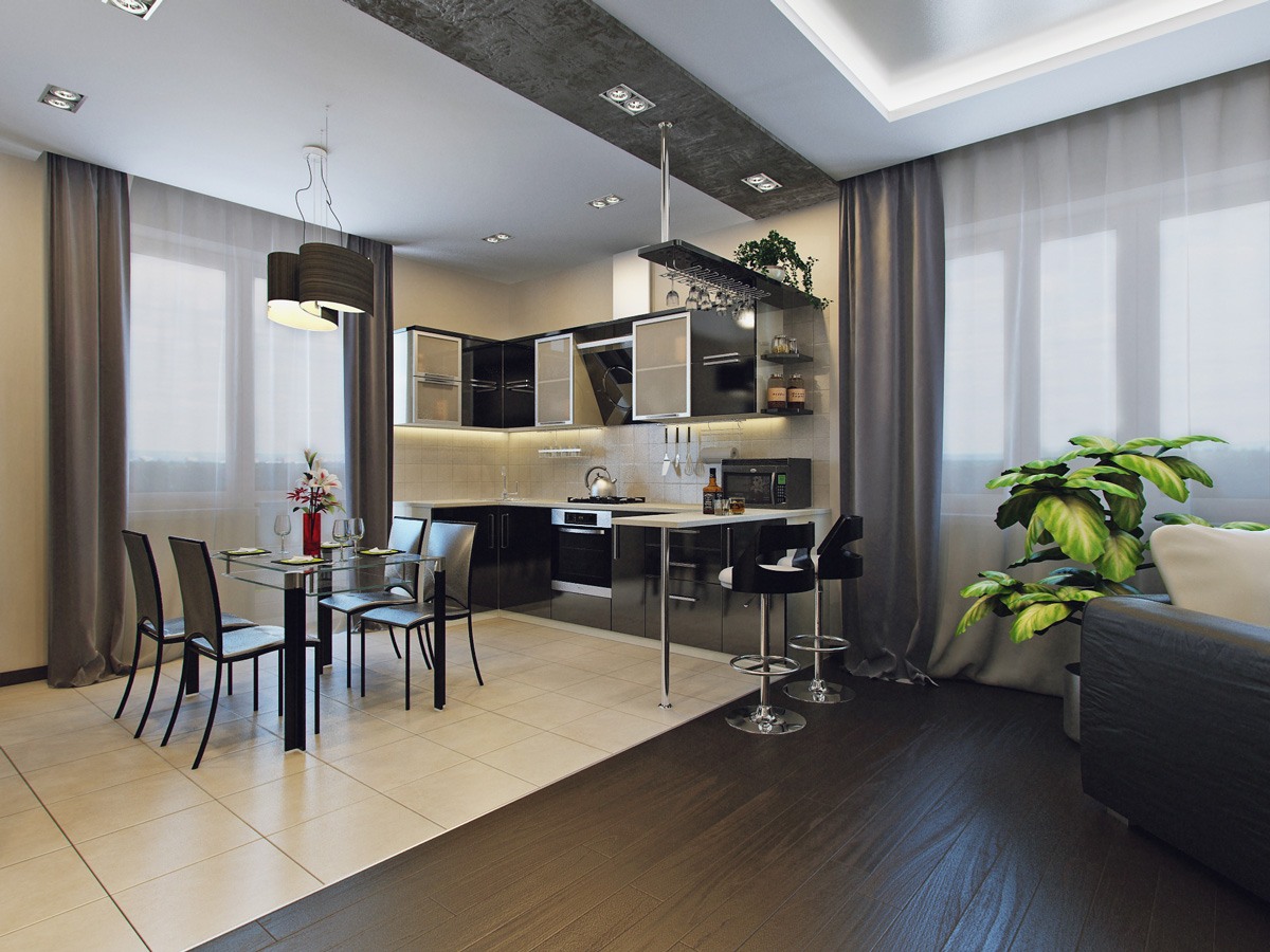 La popularité de la cuisine-salle à manger dans la conception de la pièce peut s'expliquer par le manque de murs et de motifs volumineux, de sorte que l'intérieur devienne le plus clair possible et que la pièce soit lumineuse. Dans ce cas, le comptoir de bar servira non seulement d’élément fonctionnel, mais également d’élément décoratif. Ses avantages incluent: