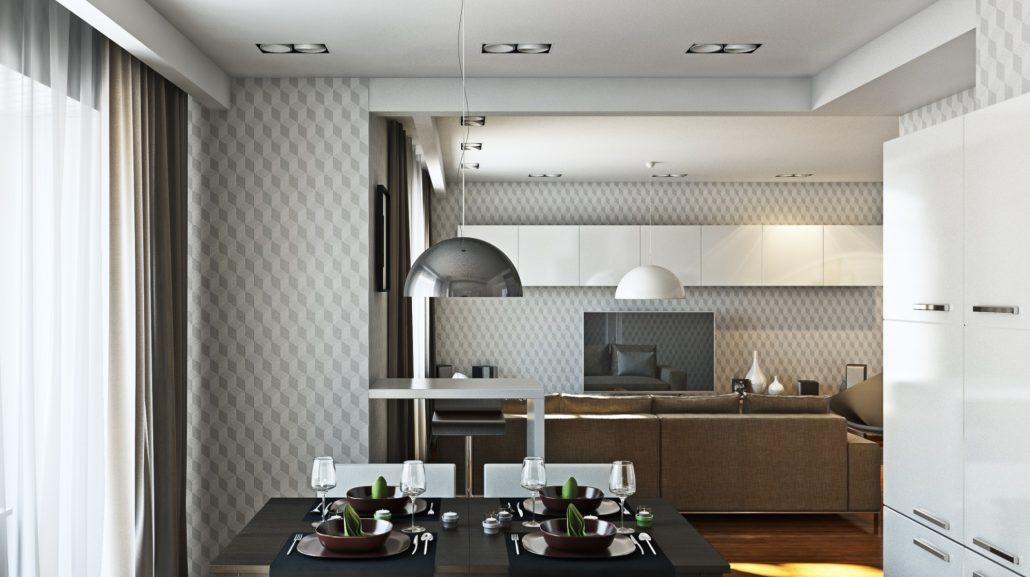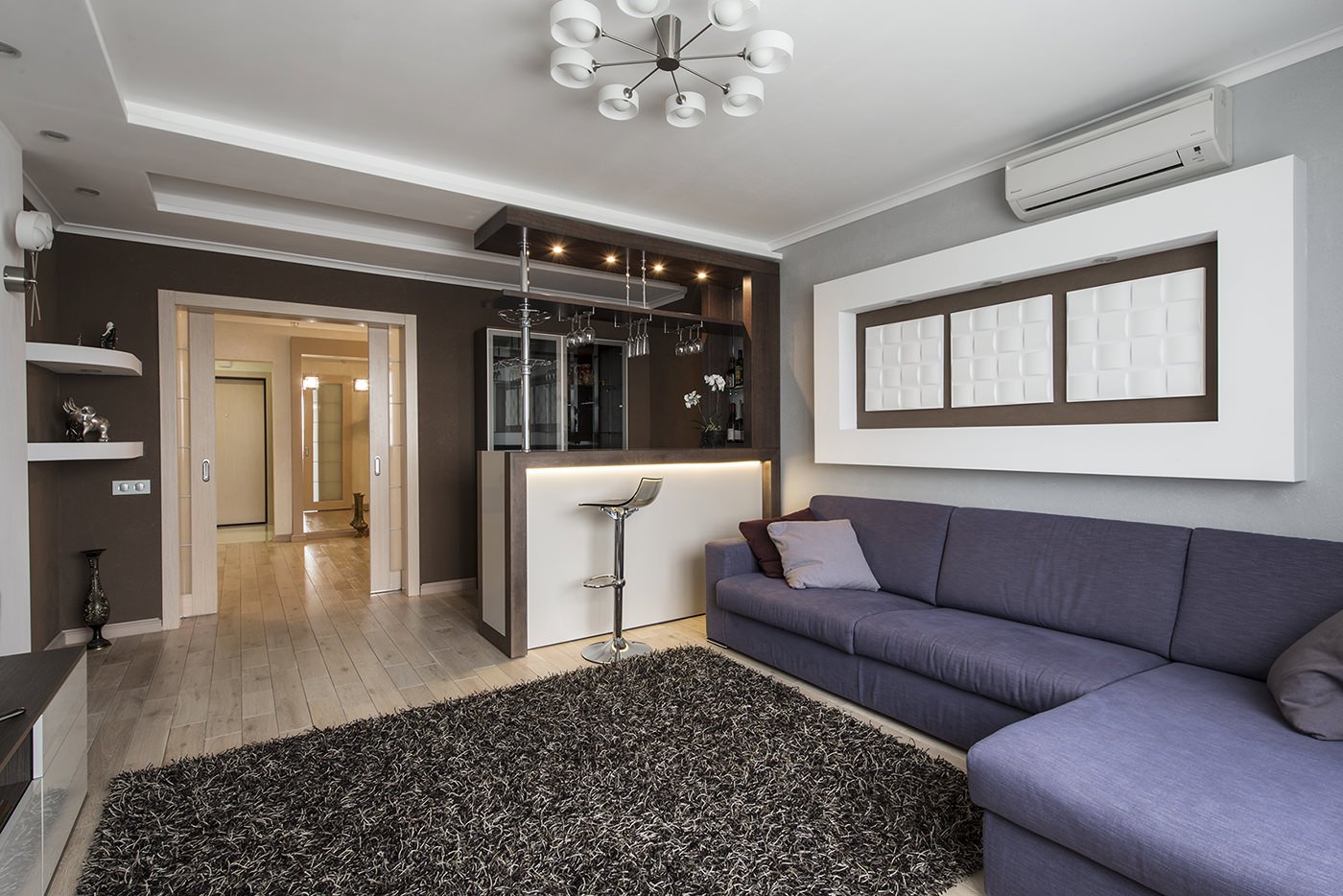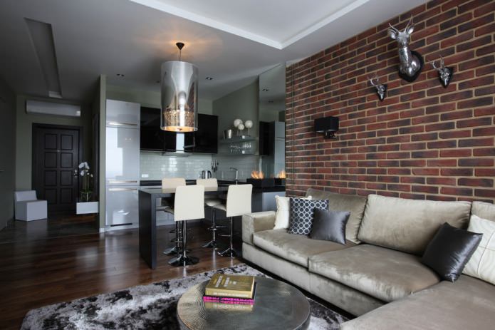Ce style sera une aubaine pour les petits appartements. Le comptoir du bar sert de séparateur entre le salon et la cuisine. Son style, sa forme et ses couleurs doivent répéter les contours d'un ensemble de meubles. Dans une telle pièce, le comptoir peut remplacer avec succès la table à manger, ce qui la rendra pratique et ergonomique. À proximité, des chaises hautes auront fière allure.