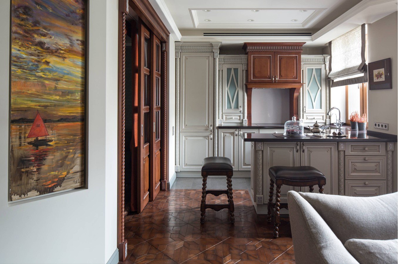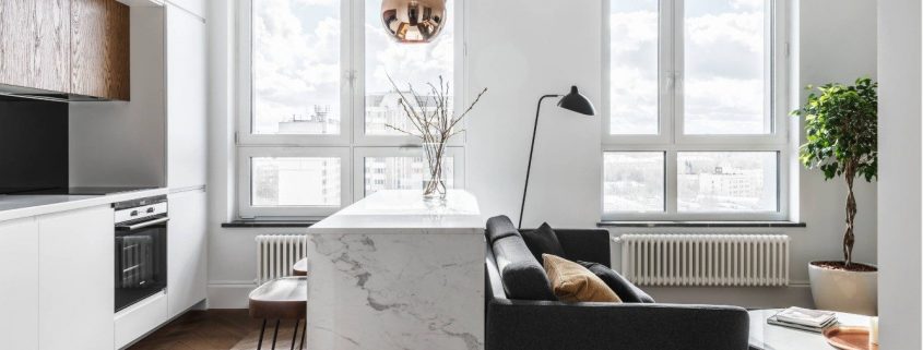 En outre, le comptoir sert de sorte de séparateur pour la cuisine et le salon. Contrairement aux arches populaires entre les pièces, il zonage l'espace sans effet encombrant.