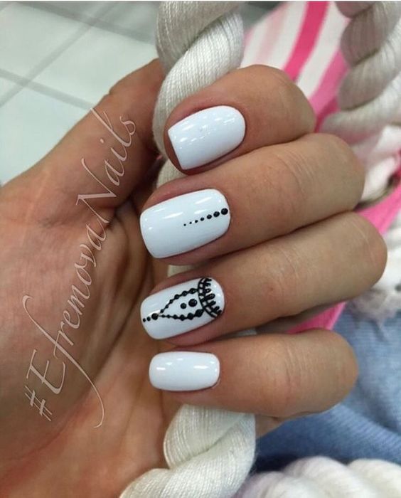 La couleur du vernis dans la manucure féminine est très importante. Et à de nombreux égards, cela dépend de l'humeur du propriétaire et du déroulement de la journée. Il y a beaucoup de détails, mais une solution consiste à choisir un revêtement blanc avec une impression minimaliste. Une telle conception de clou est idéale à la fois pour travailler au quotidien et pour se détendre et se divertir dans une boîte de nuit. Comment déterminer le motif dans le style du minimalisme sur une manucure blanche? Les lignes courbes géométriques et les points de différentes tailles ont l’air idéal.