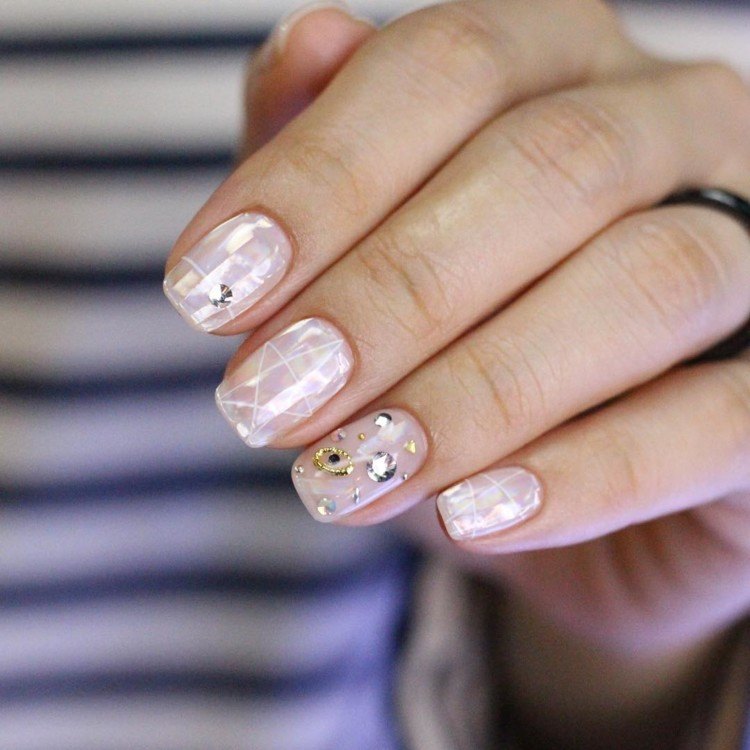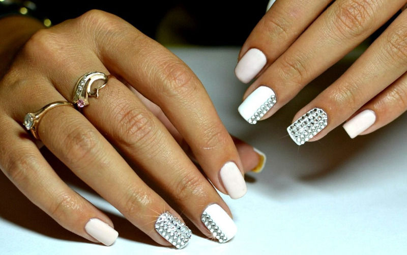 Manucure à la mode en blanc avec des strass et un éclat glamour.