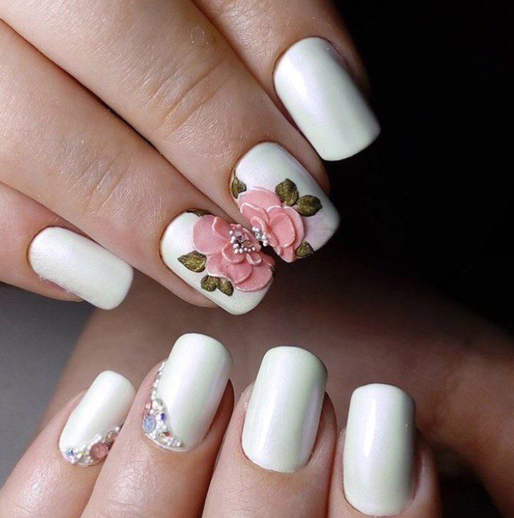 Comment rendre une manucure blanche plus parfaite et plus expressive? La réponse est simple: choisissez un ou deux soucis avec une sculpture de fleurs chic. Avec une telle décoration en stuc grandiose, une manucure deviendra immédiatement colorée et excitante. Une belle sculpture volumineuse est spectaculaire sur les ongles allongés des femmes, avec un caractère volontaire et déterminé.