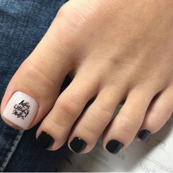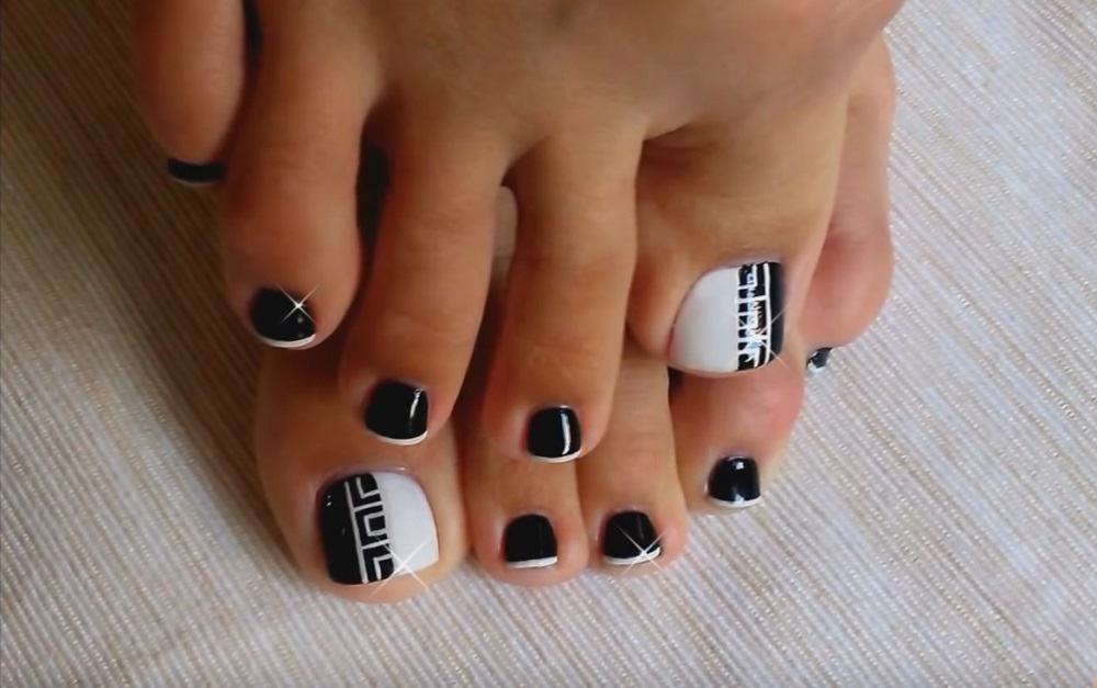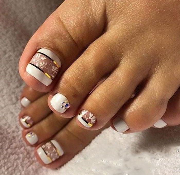 Les motifs géométriques sont un excellent moyen de compléter une pédicure blanche. Cette conception est sophistiquée pour les filles qui préfèrent le style militaire. Des lignes lisses sur un fond blanc peuvent être réalisées en différentes couleurs. Les plus pertinents d'entre eux: noir, or, argent, marron, vert foncé et bordeaux. Une telle pédicure est très belle et inhabituelle. Effectuer des motifs géométriques sur un ou plusieurs ongles. Des strass brillants peuvent être ajoutés à volonté.