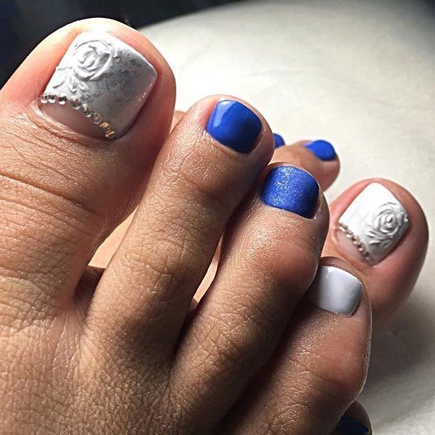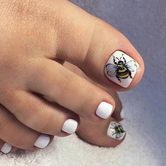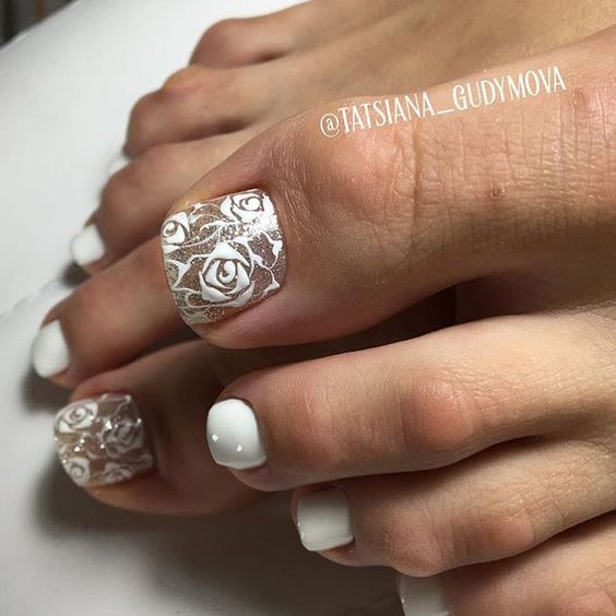 Si un pédicure blanc uni semble ennuyeux et inachevé, les experts en art des ongles vous conseillent de le compléter avec un imprimé floral ou des dessins de différentes plantes. Ainsi, la pédicure prendra vie et attirera une attention particulière. Vous pouvez créer de grandes, petites ou des moitiés de fleurs sur chaque ongle, mais il est préférable de décorer un pouce de cette façon et de laisser le reste blanc. Pour faire les mêmes fleurs ou d'autres plantes, vous pouvez appliquer l'estampage ou utiliser une variété d'autocollants.