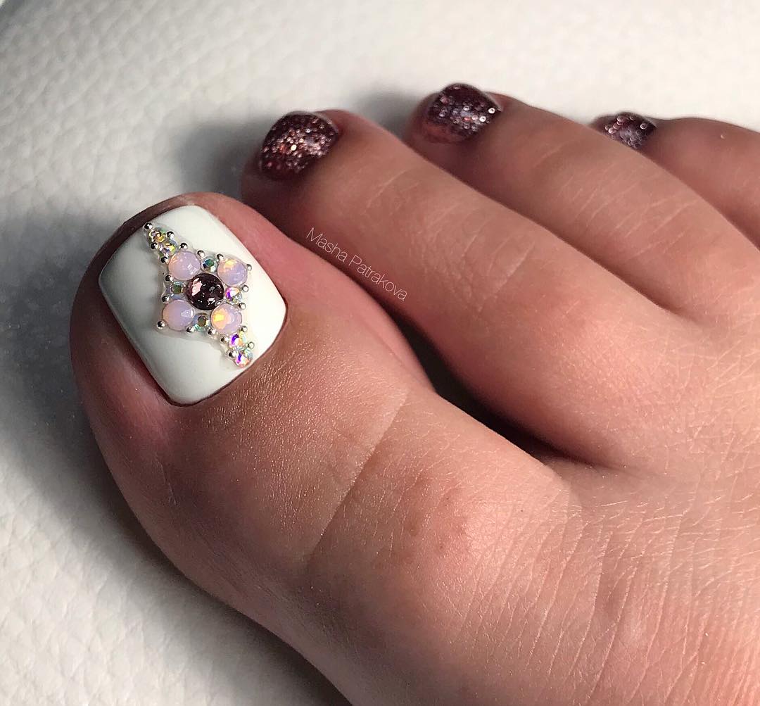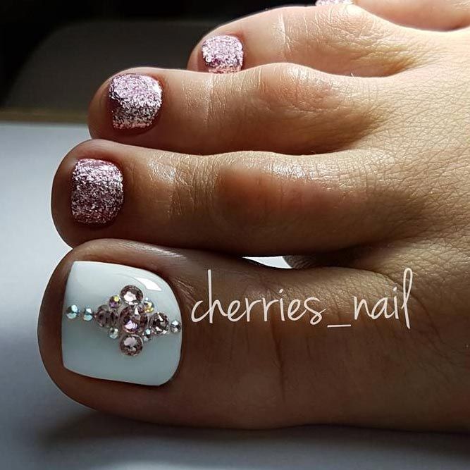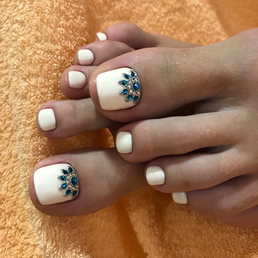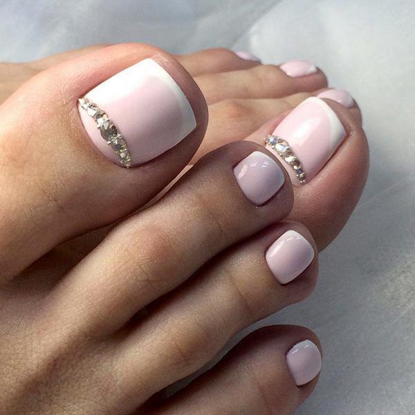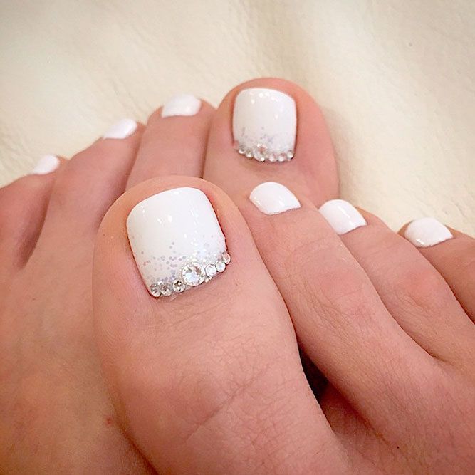 Sans aucun doute, le pédicure blanc est très beau, mais si vous l’ajoutez avec des strass brillants, l’aspect des jambes changera de manière significative. Les strass sont en mesure de mettre l'accent sur le toilettage et l'attractivité. Les strass sont principalement utilisés au niveau de la cuticule, et même un léger motif peut être créé sur un gros clou. L'essentiel est qu'il n'y ait pas trop de décor sur les ongles, sinon l'aspect délicat de la pédicure se transformera en un design accrocheur et rugueux.