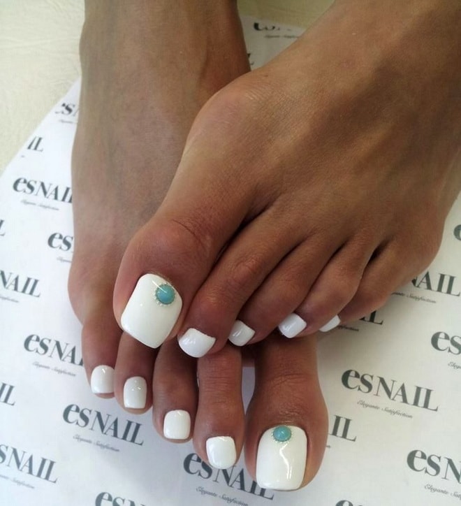 Un enduit entièrement blanc de soucis est une décision plutôt extraordinaire et audacieuse, de sorte que toutes les filles ne peuvent oser prendre une telle pédicure. Dans ce cas, la forme des ongles doit être parfaitement sciée, car la couleur blanche attire immédiatement l’attention. On y voit aussi toutes les irrégularités et les taches. Une solution plus originale sera une finition mate, bien que peu de gens l'appellent pratique. En été, les bagues et les bracelets peuvent compléter le pédicure blanc.