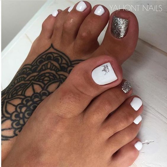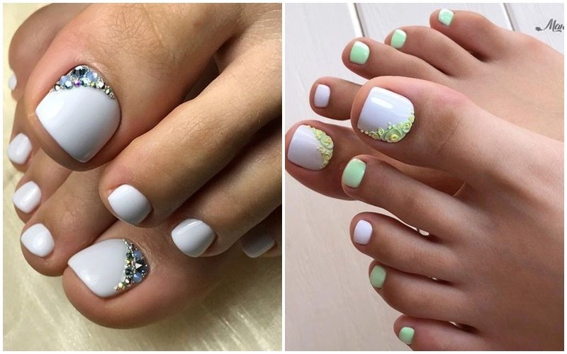 Cette année, le blanc domine le reste des tons. Mais il convient de noter que pour une pédicure, vous pouvez choisir le lait, le rose pâle, le gris clair ou simplement une couleur classique blanche. Très souvent, cette couleur est utilisée comme élément d'accent. Ils couvrent le plus souvent le pouce. La couleur universelle se combine très bien avec tous les autres tons, ce qui explique sa popularité incroyable. Cette année, l'utilisation de divers décors a gagné en popularité. Et avec quels tons et éléments de décoration exactement pour combiner une belle pédicure blanche, nous dirons plus loin.
