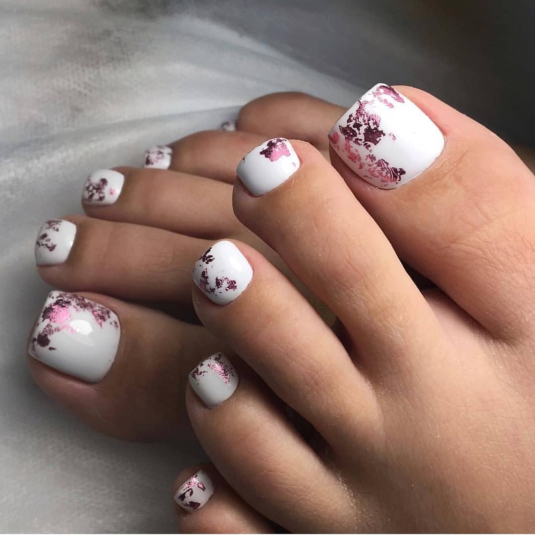 Récemment, le monde semble être devenu fou, chaque fille veut utiliser un décor à la mode dans son pédicure - du verre brisé.Il est à noter que c'est sur le ton blanc que le verre semble le plus avantageux, le plus attrayant et le plus soigné. Les morceaux de mica utilisés dans cette conception sont collés de manière chaotique, ils peuvent être utilisés pour créer un motif spécifique, remplir n'importe quelle partie du souci ou du doigt en entier.