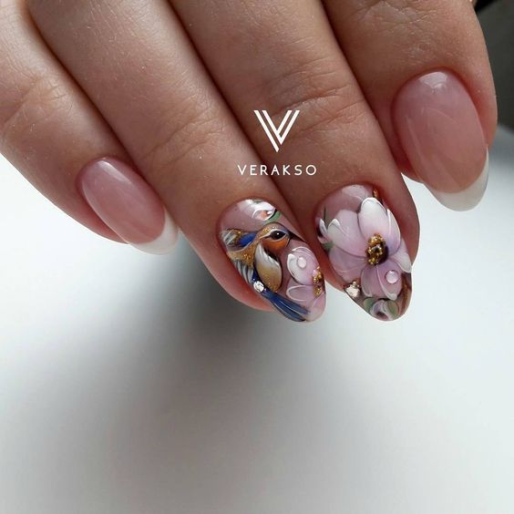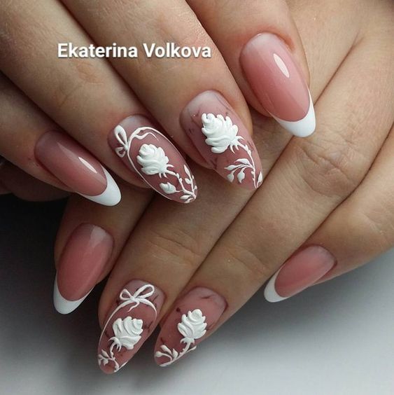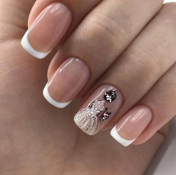 Souvent, un ton beige est utilisé pour représenter la manucure française. Cette option polyvalente s’intégrera parfaitement dans vos images de tous les jours et pour la publication. Pour certains, une manucure française de couleur beige peut sembler ennuyeuse et ordinaire. Dans ce cas, vous pouvez le diluer avec un décor.