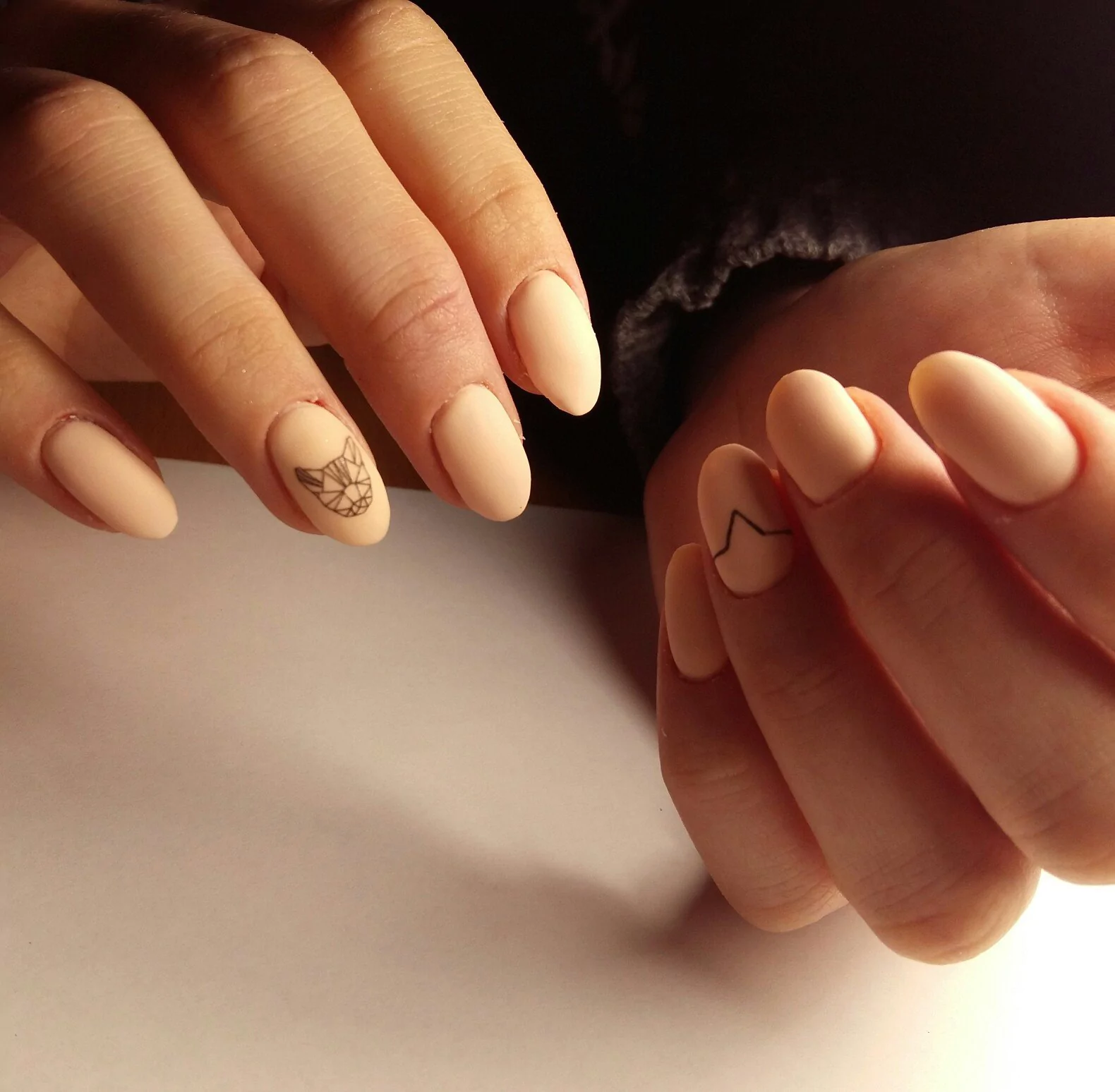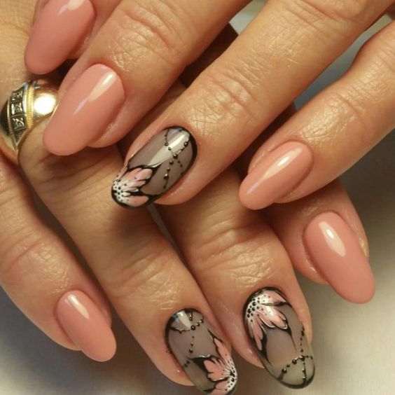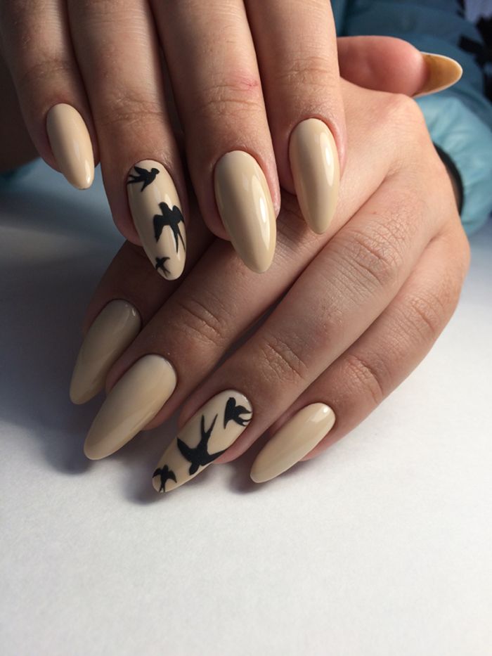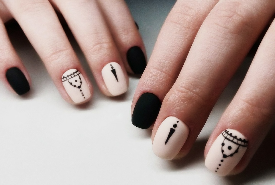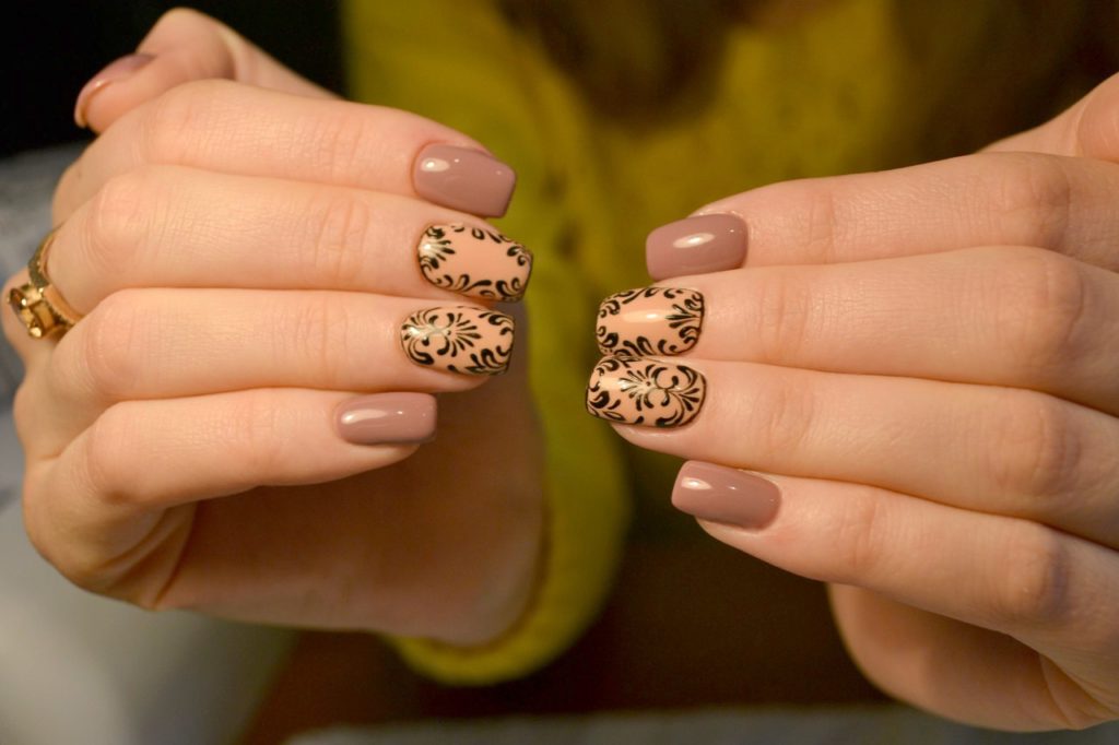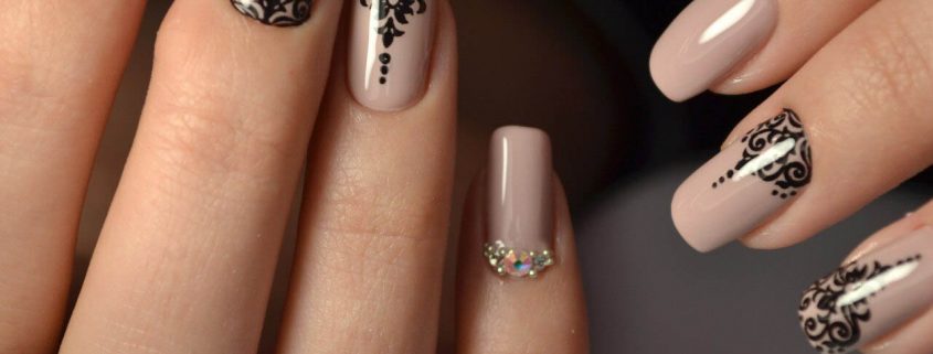 La manucure beige avec adjonction de vernis noir se marie bien avec la technique française lorsque la couleur blanche de la bande sur le bout de l’ongle est remplacée par du noir. À l’aide d’une teinte noire, vous pouvez représenter un dessin ajouré d’un bas ou d’une empreinte d’animal, qui est actuellement très populaire.