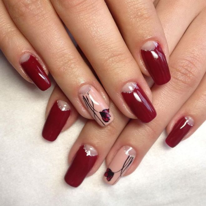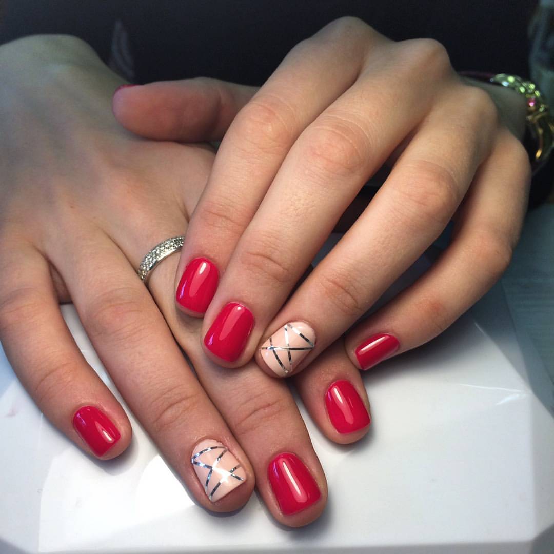 La manucure rouge-beige a l'air très juteuse en raison de son accent lumineux qui ajoute une couleur rouge. Cette année, la manucure beige mate est la plus populaire. Vous pouvez recouvrir tous les ongles d'un ton beige mat et mettre en surbrillance deux doigts des deux mains en rouge vif.Une telle manucure aura l'air très féminine et extravagante. Une veste rouge sur une base beige est également considérée comme une bonne option. Il vaut la peine d’ajouter à ce dessin sur le décor une image délicate de fleurs ou de motifs.