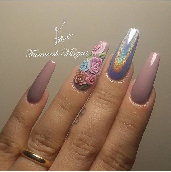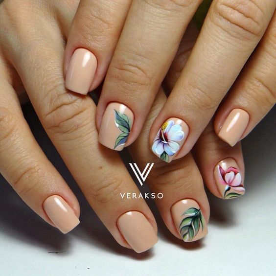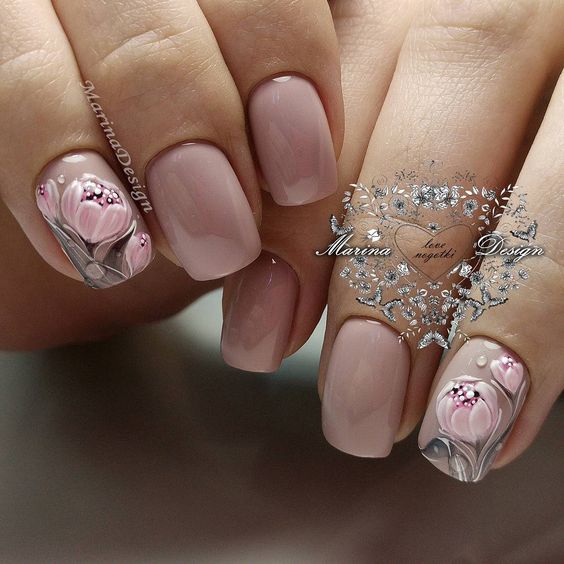 Manucure beige avec une palette rose.