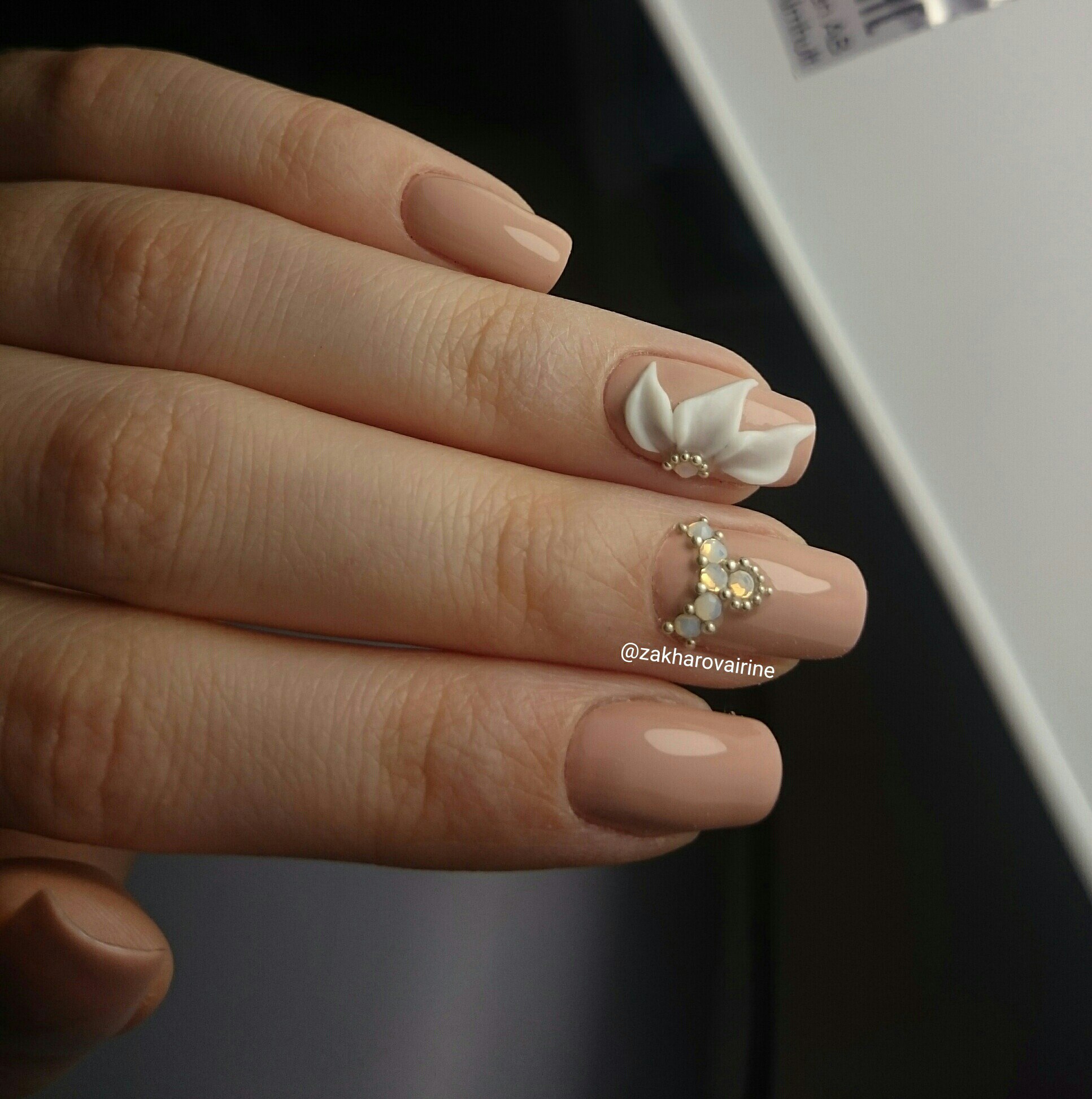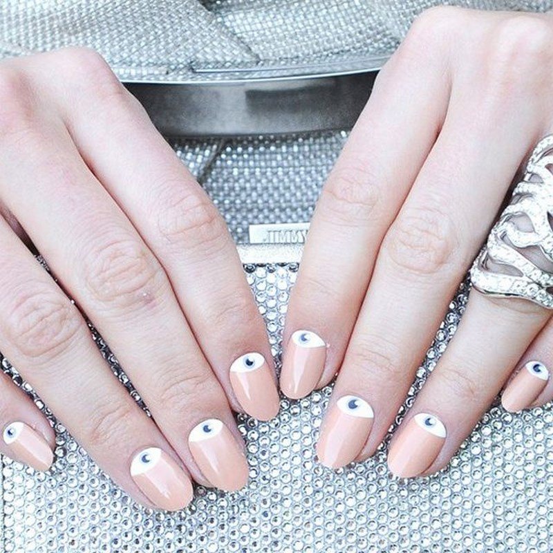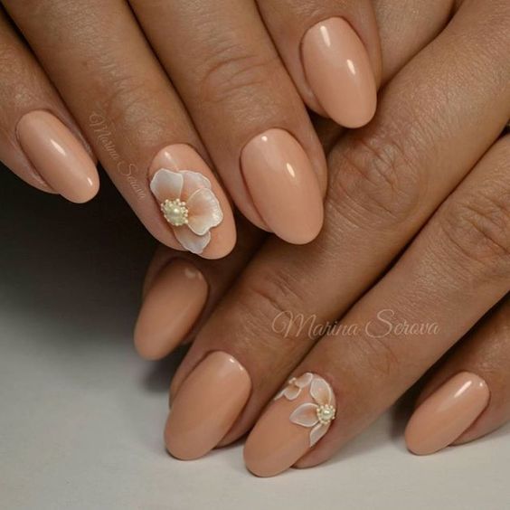 Manucure beige avec des éléments blancs.
