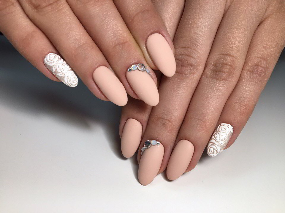 Lorsque vous ajoutez des motifs subtils et élégants en blanc ou un beau motif, vous pouvez créer une manucure très attrayante. En le complétant avec des éléments décoratifs sous forme de strass, vous pouvez obtenir une option de fête charmante qui conviendra à la tenue la plus diverse.