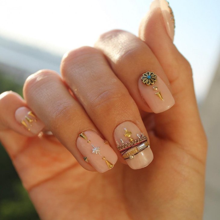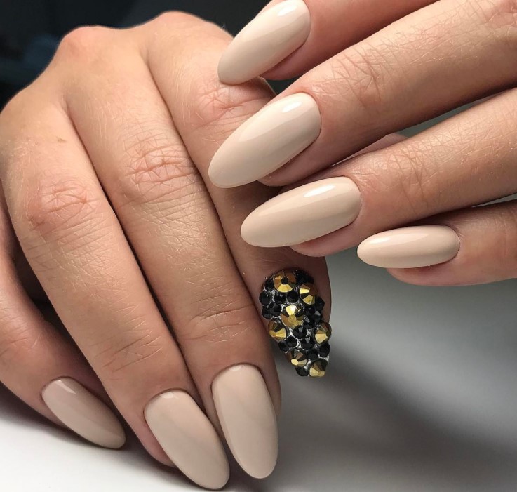 Une manucure dans un ton beige aura l’air frais si vous y ajoutez divers détails. La tendance en matière de design est un décor métallique, une manucure élégante avec des confettis et des étincelles. Si vous souhaitez diversifier le design, une bonne option serait de mettre un motif élégant de strass sur un ou plusieurs ongles. En ce qui concerne la combinaison de couleurs lors de l'exécution d'un ornement sur une plaque à ongles, leur choix est vaste. Le ton beige se marie élégamment avec des nuances vibrantes. La manucure à base beige peut être combinée avec du bleu, du rouge et du vert. Vous pouvez également représenter une image en argent, or, ton marron. Une combinaison plus élégante de beige avec turquoise. Cette version estivale est douce et provocante.