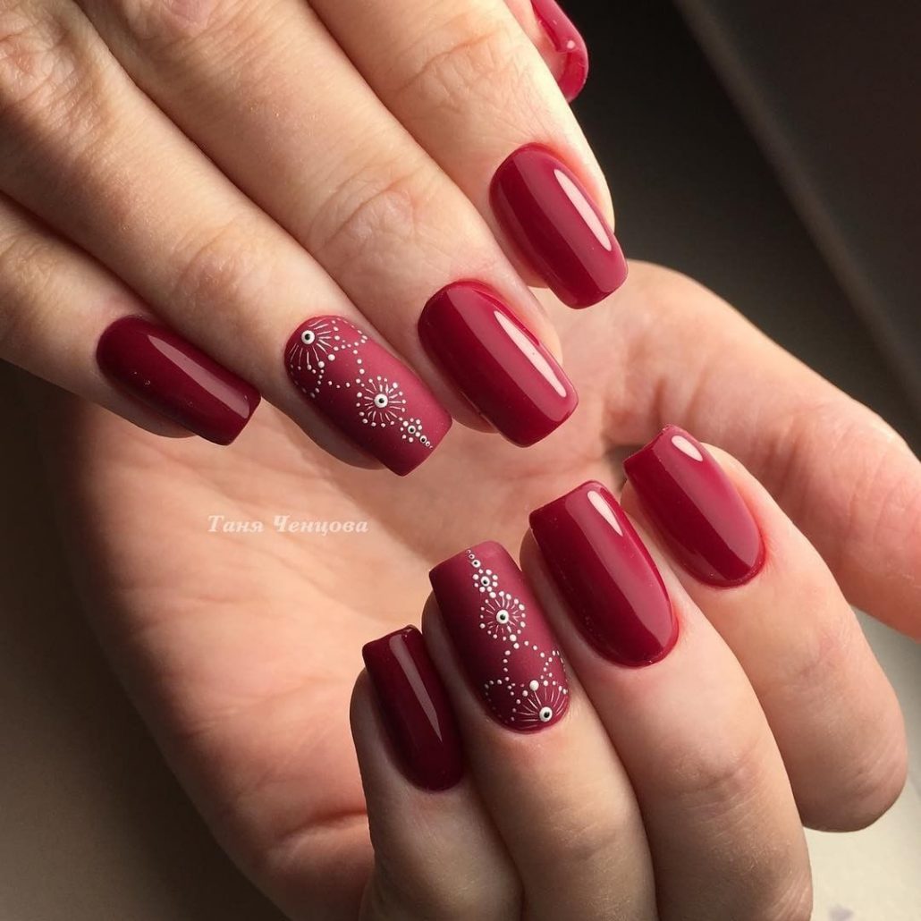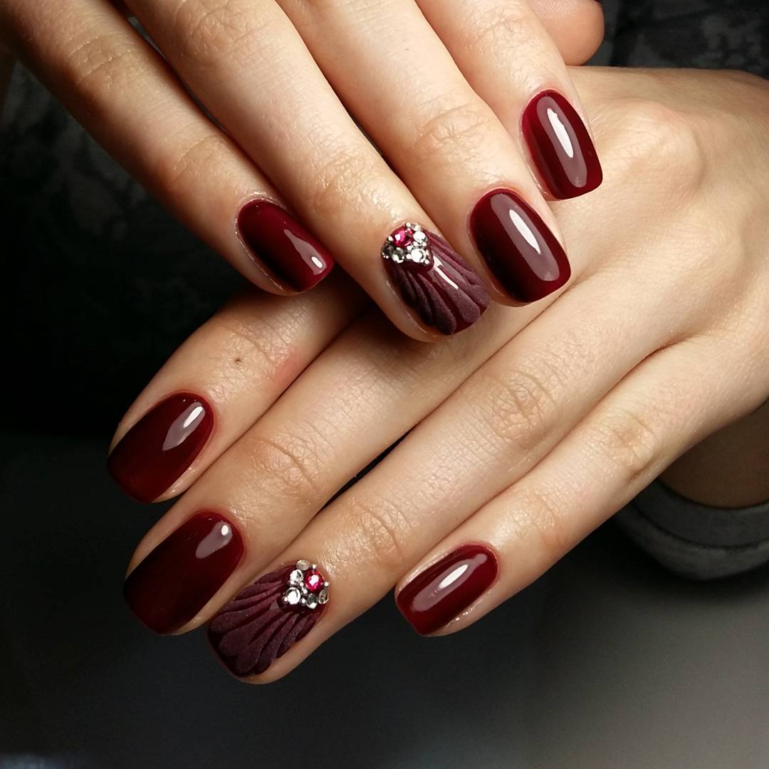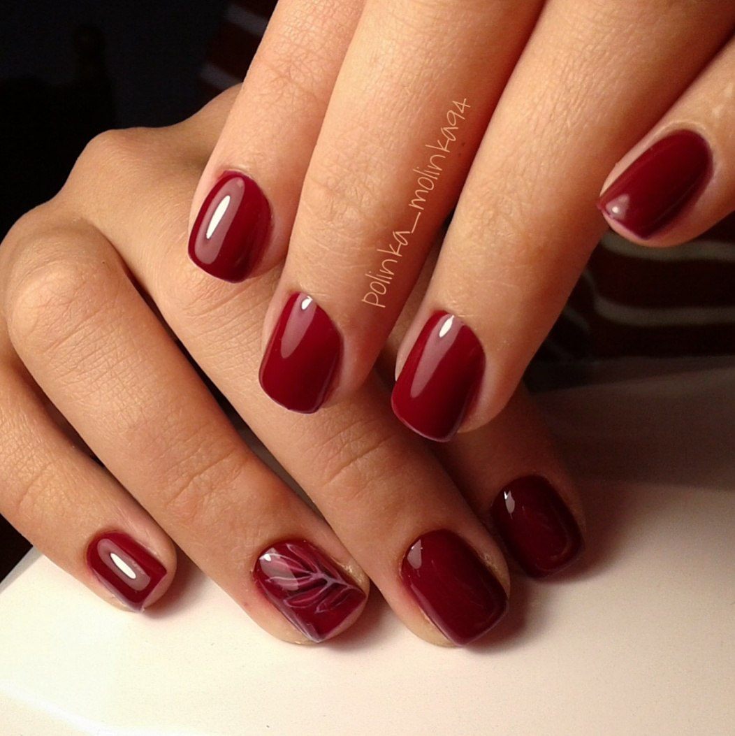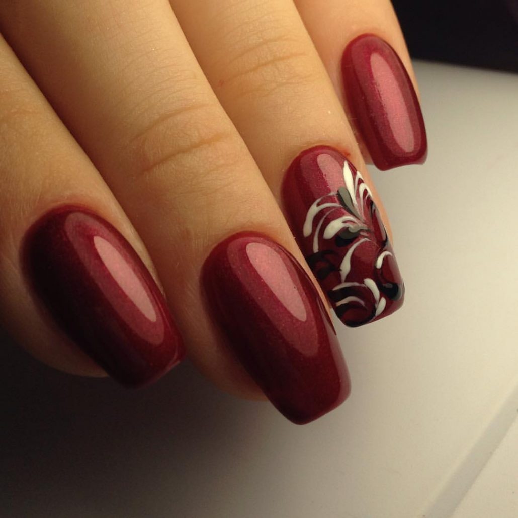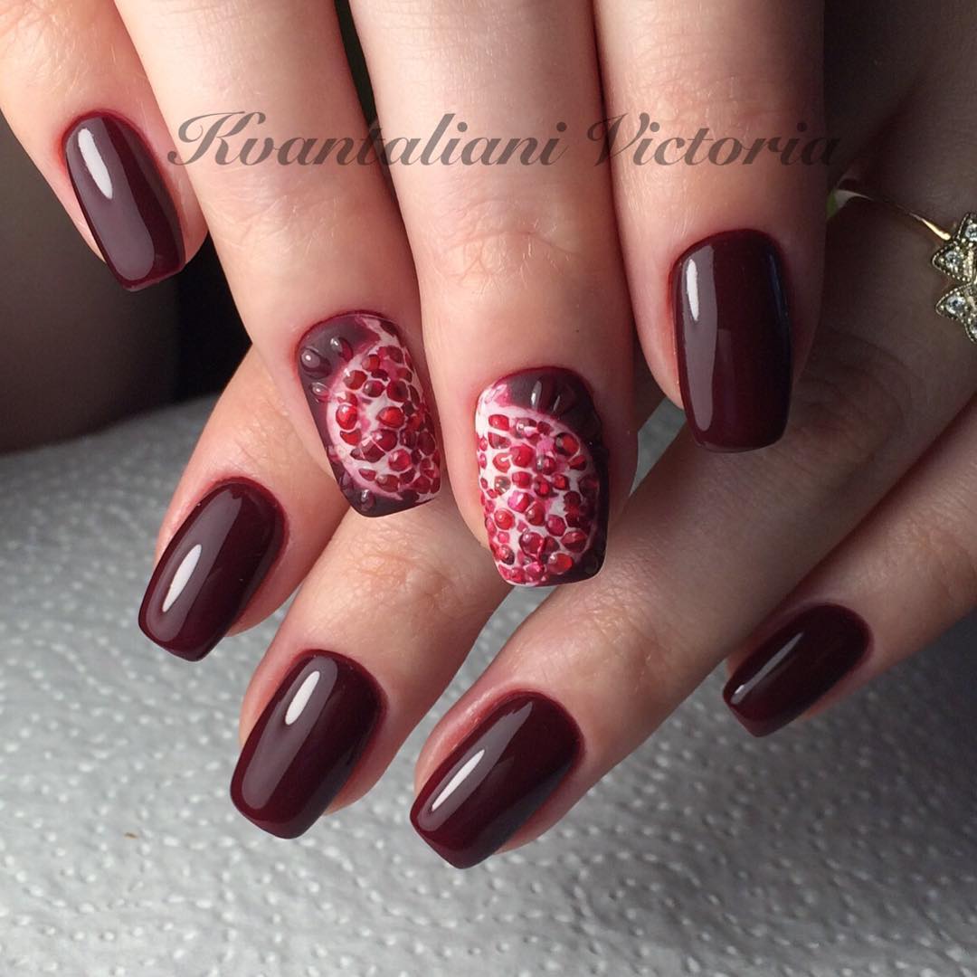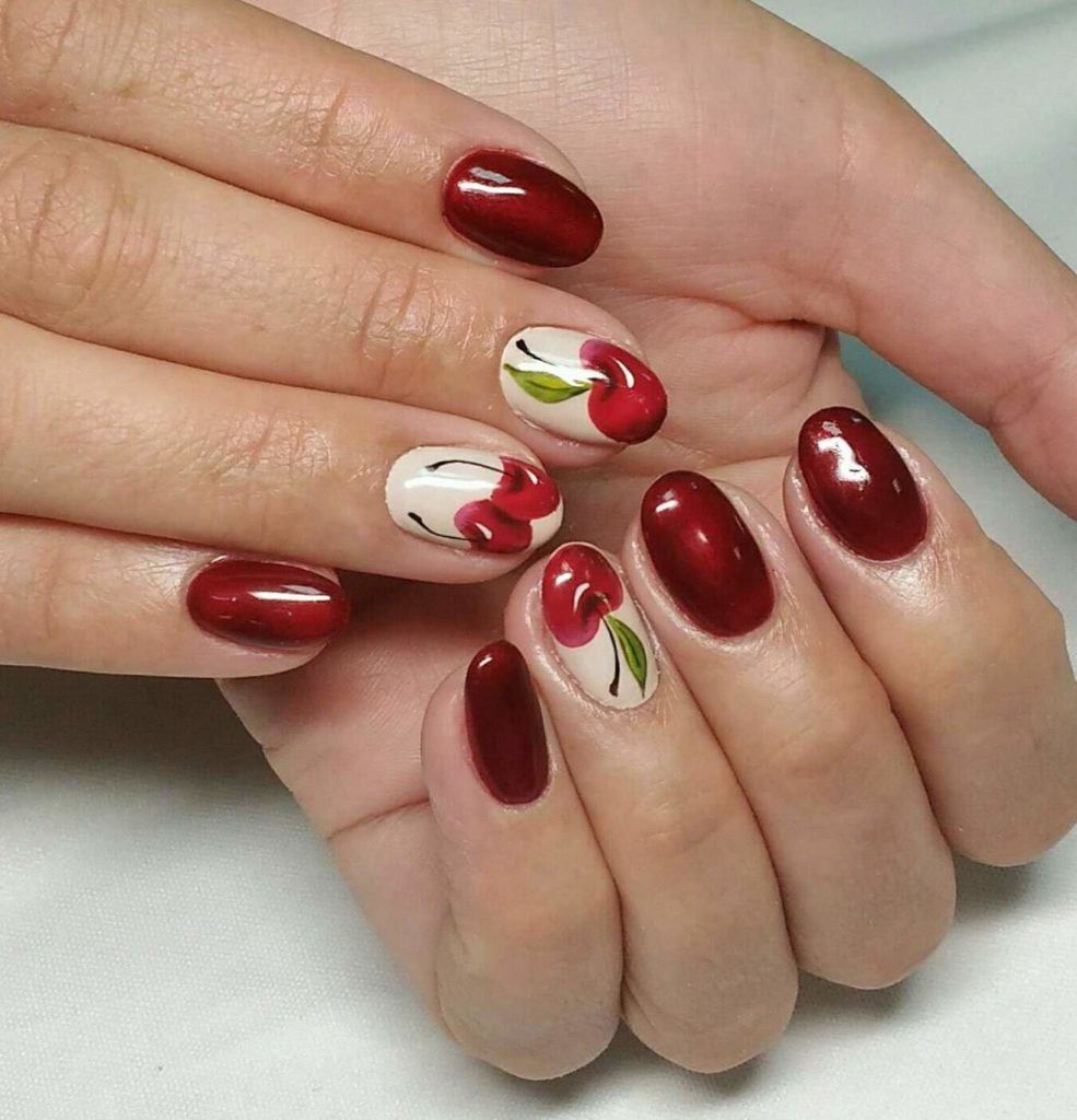 Une manucure avec des cerises peintes sera pertinente en été. Les jouets de Noël peuvent décorer la manucure du nouvel an. Le cœur bordeaux dessiné sera pertinent pour la Saint-Valentin. Un site Web dessiné sur un fond bordeaux vous permettra de devenir la vedette d’une soirée à thème dédiée à Halloween.