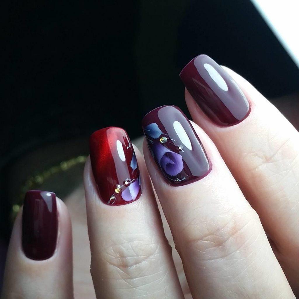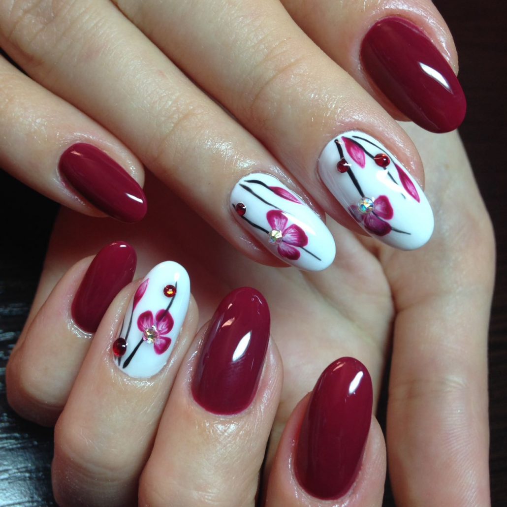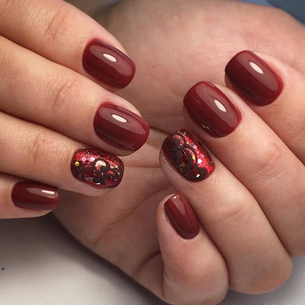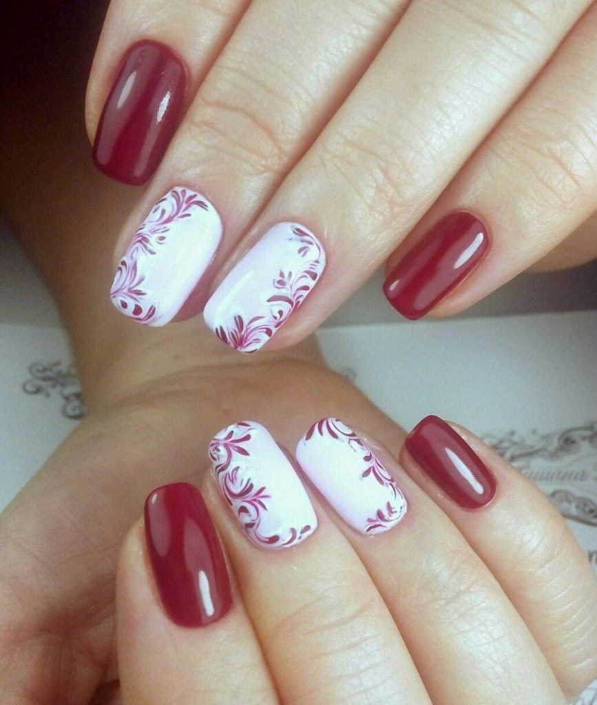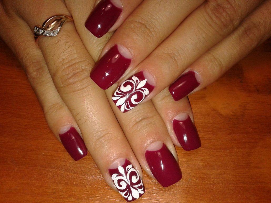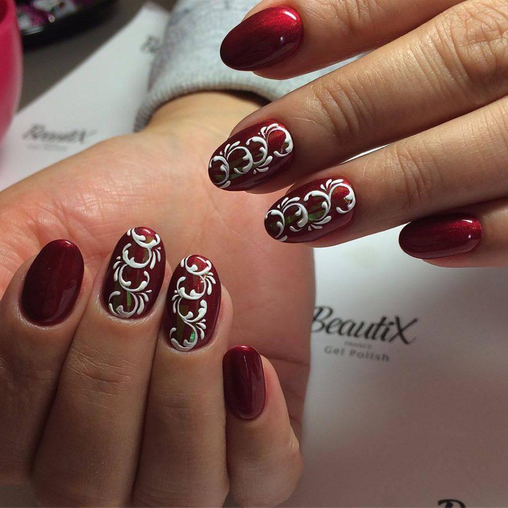 Une manucure avec des cerises peintes sera pertinente en été. Les jouets de Noël peuvent décorer la manucure du nouvel an. Le cœur bordeaux dessiné sera pertinent pour la Saint-Valentin. Un site Web dessiné sur un fond bordeaux vous permettra de devenir la vedette d’une soirée à thème dédiée à Halloween.