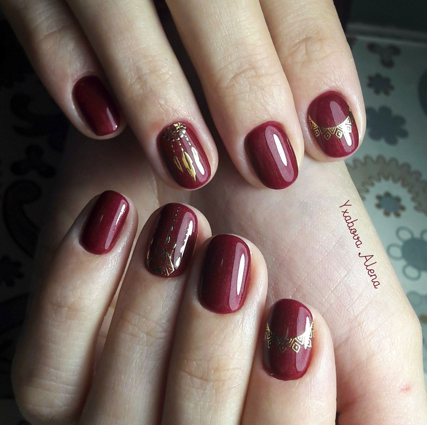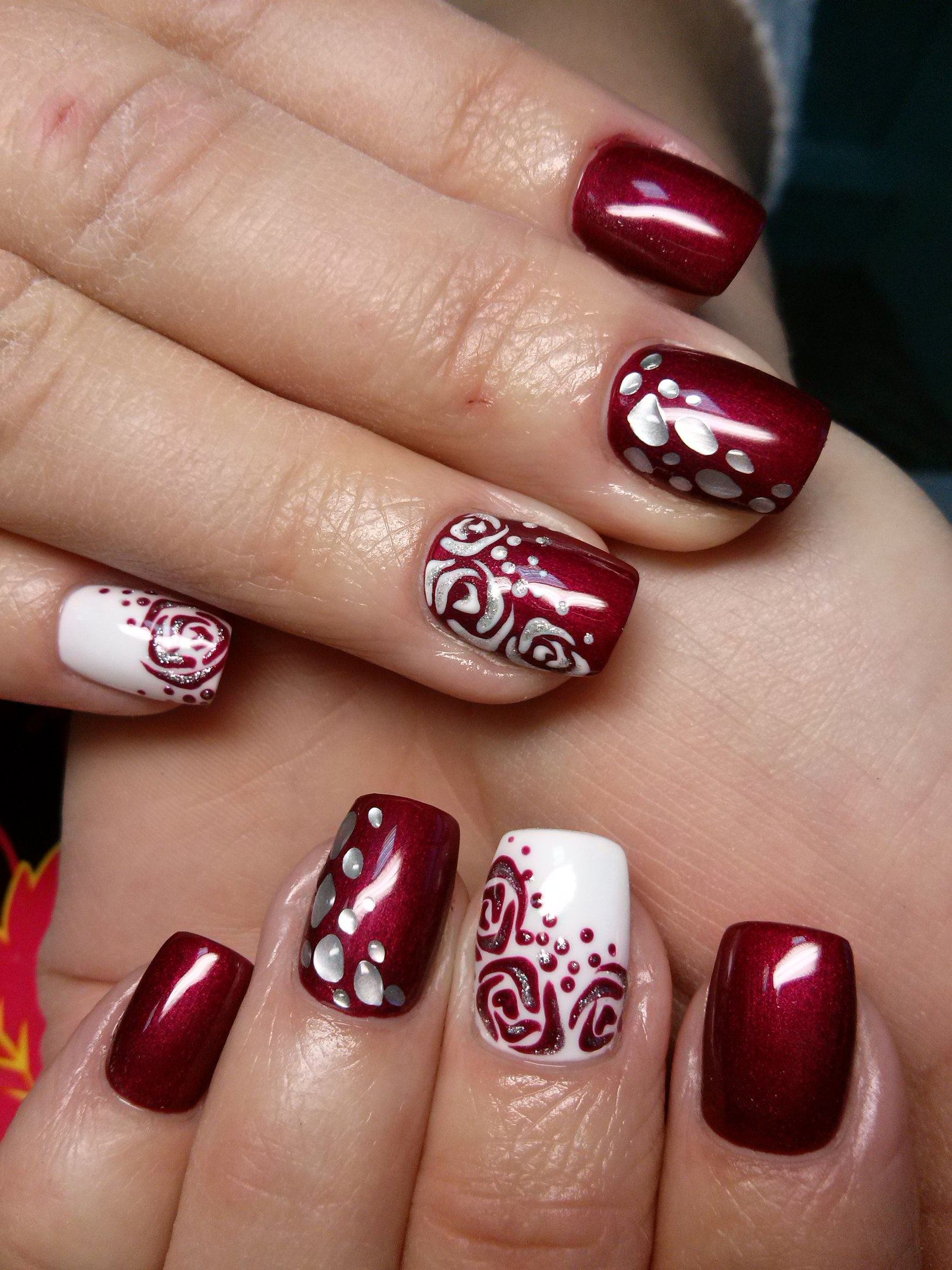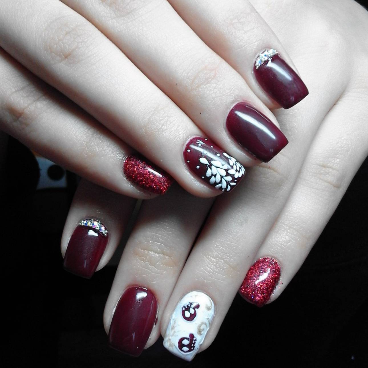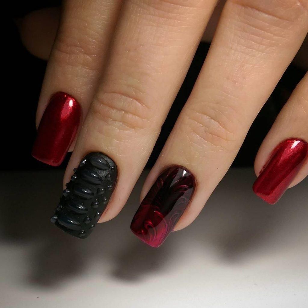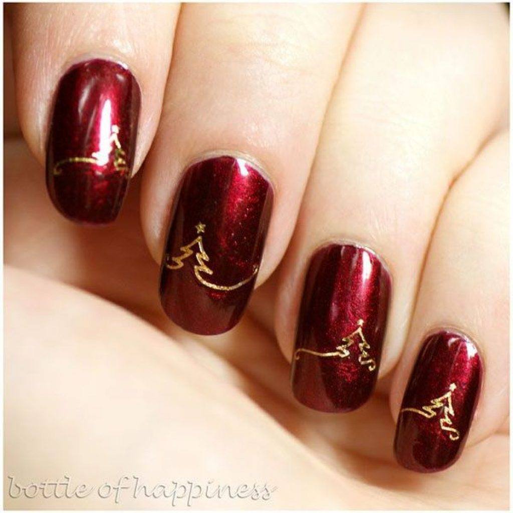 Une manucure avec des cerises peintes sera pertinente en été. Les jouets de Noël peuvent décorer la manucure du nouvel an. Le cœur bordeaux dessiné sera pertinent pour la Saint-Valentin. Un site Web dessiné sur un fond bordeaux vous permettra de devenir la vedette d’une soirée à thème dédiée à Halloween.