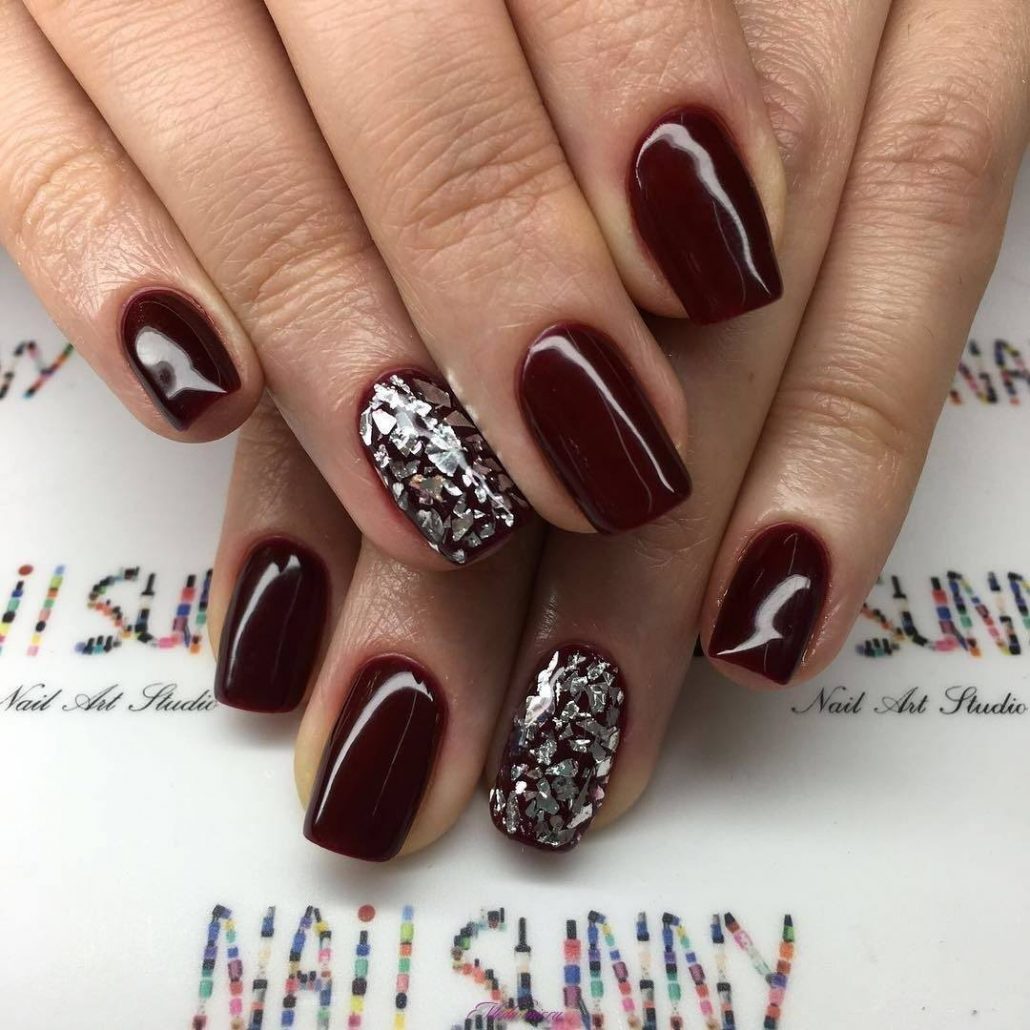 En plus des cailloux, la manucure bordeaux peut être décorée avec des morceaux de papier d'aluminium. Quelle que soit la teinte dorée ou argentée que vous choisissez, vous obtiendrez une dispersion spectaculaire de fragments de verre sur les ongles bordeaux.