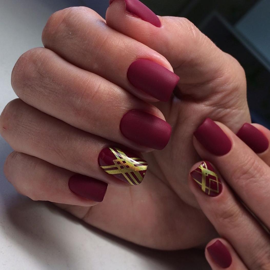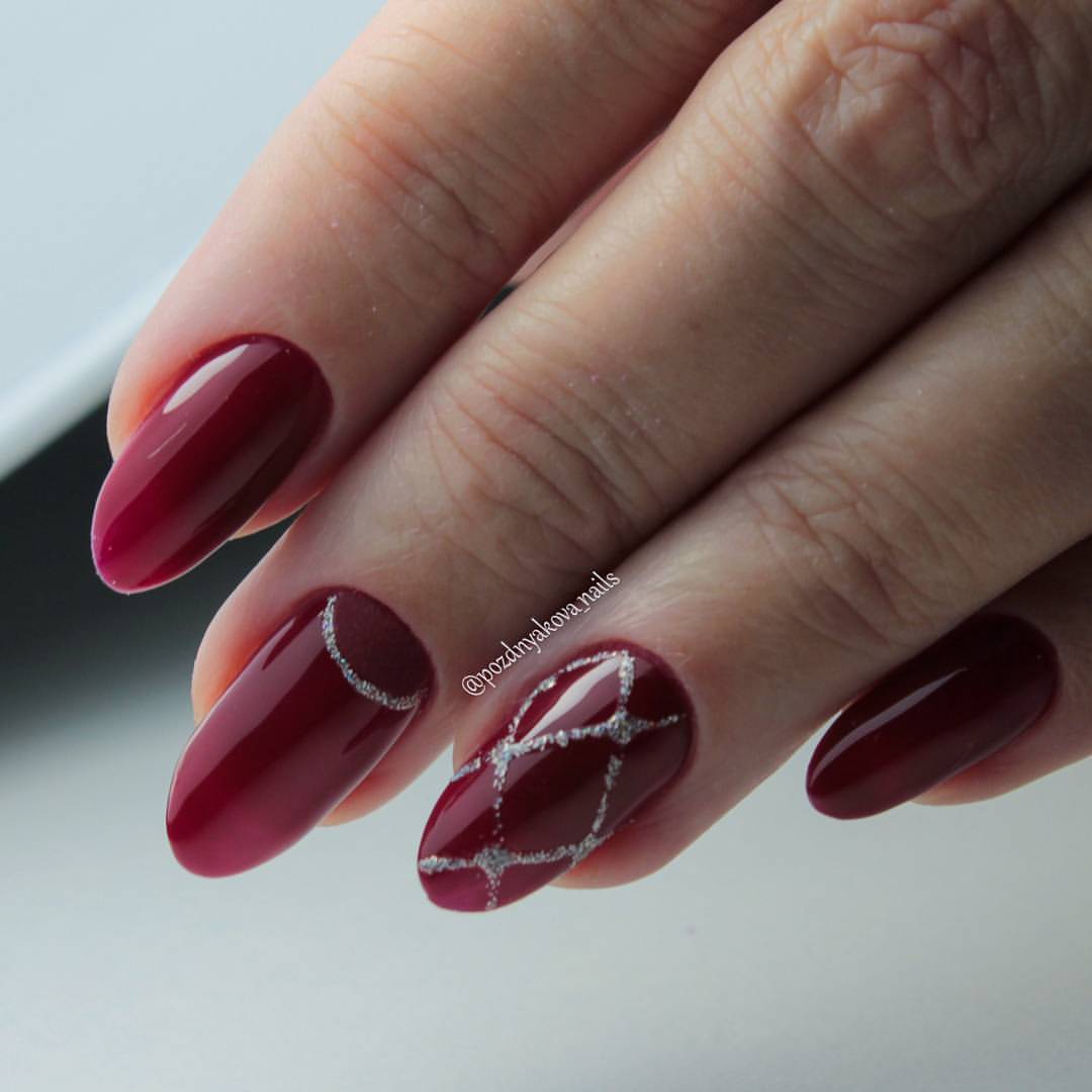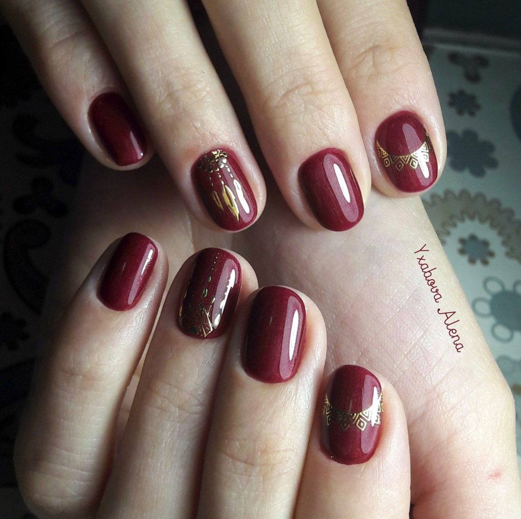 Différentes nuances peuvent compléter la saturation du bordeaux. Tout d’abord, c’est le classique noir, blanc et or. Vous pouvez décorer une manucure bordeaux avec un frottis, une poudre ou une feuille.