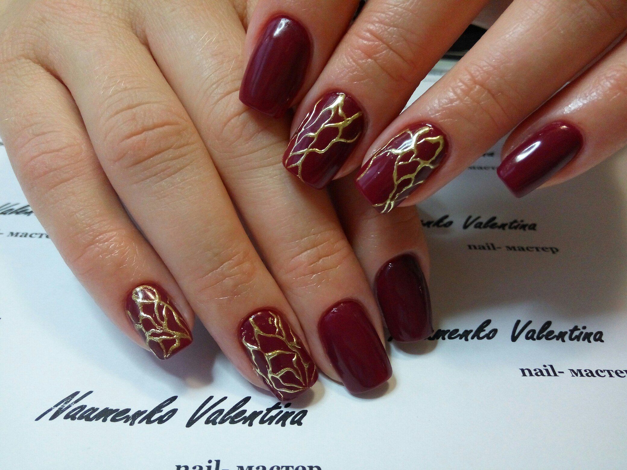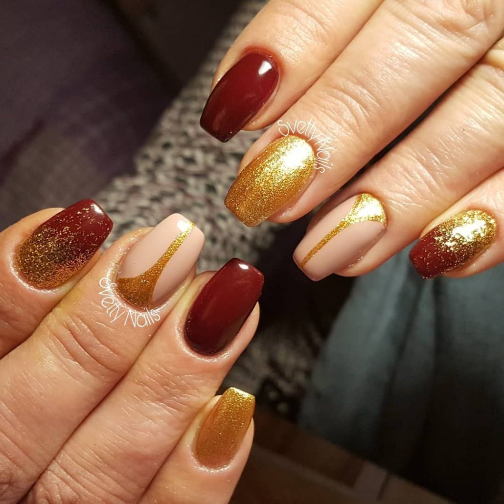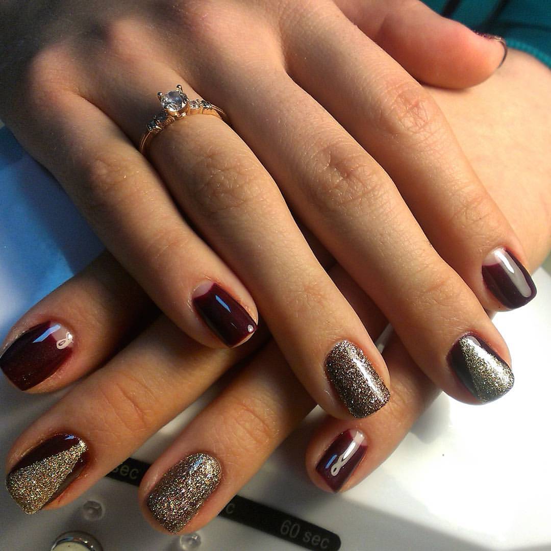 L'association du bordeaux avec de l'argent ou de l'or est idéale pour un look de soirée. Quelle que soit la longueur de l'ongle, la manucure sera élégante et luxueuse. Les options de combinaison peuvent être nombreuses. Il peut s'agir d'un vernis doré sur l'annulaire, tandis que tout le reste sera bordeaux. Golden peut décorer la pointe du souci Bourgogne. Il est également possible de dessiner des dessins sur un fond bordeaux en or.