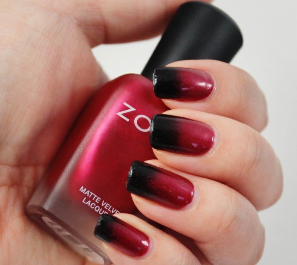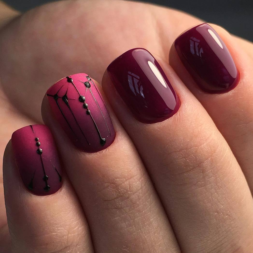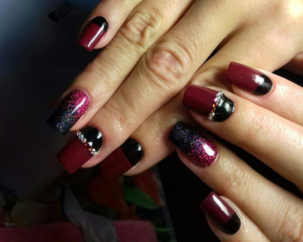 La technique de manucure en dégradé est très intéressante et vous permet de créer des images époustouflantes. Il est préférable d'utiliser du bourgogne en combinaison avec du vernis noir. Ceux qui trouvent cette combinaison trop sombre peuvent les appliquer sur une couche de finition rouge ou autre. Les étincelles et les strass contribueront à ajouter du mystère et de l'éclat à un tel design.