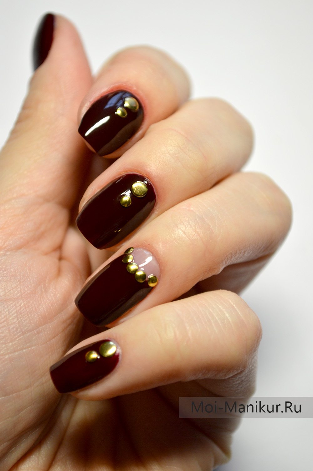 La Bourgogne est souvent utilisée dans les dessins français et lunaires. Il semble attrayant dans une manucure à gradient, avec vernis noir. Cependant, le revêtement monochrome dans cette nuance n'est pas moins populaire.