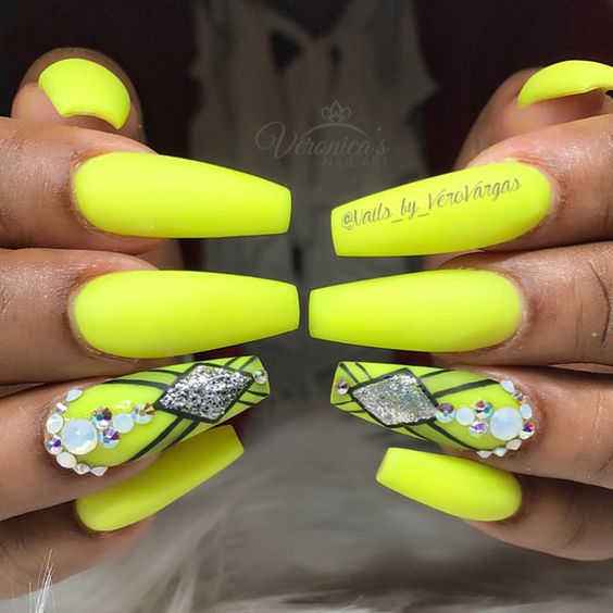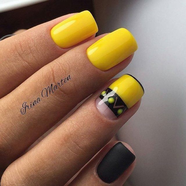 Très inhabituel, mais à la fois à la mode et élégant, il ressemble à une manucure jaune-noir avec un vernis mat. La combinaison de noir mat et de jaune brillant confère aux ongles un aspect tendance. Si vous ajoutez une quantité minimale de strass à cette conception, vous obtiendrez une manucure chic et efficace. Vous souhaitez obtenir un aspect doux et velouté de vos ongles, puis utilisez un vernis noir mat sur toute la surface, mais mettez en surbrillance un vernis jaune.