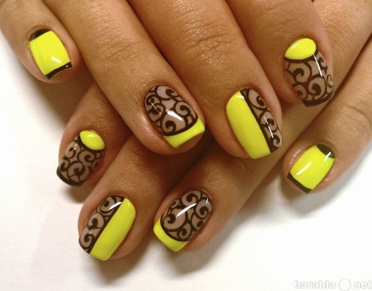 Nous voulons attirer votre attention sur la manucure ajourée. Cette décision de conception semble envoûtante. L'option la plus populaire consiste à faire un motif noir en forme de dentelle sur des tons de jaune pâle. Le dessin peut être utilisé sur tous les ongles, ainsi que sur un. La luminosité et la luminosité de la manucure dépendront du ton choisi pour le vernis jaune. Les soucis semblent assez intéressants et inhabituels si le motif ajouré est fait avec de la poudre de velours noir.