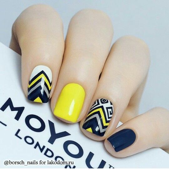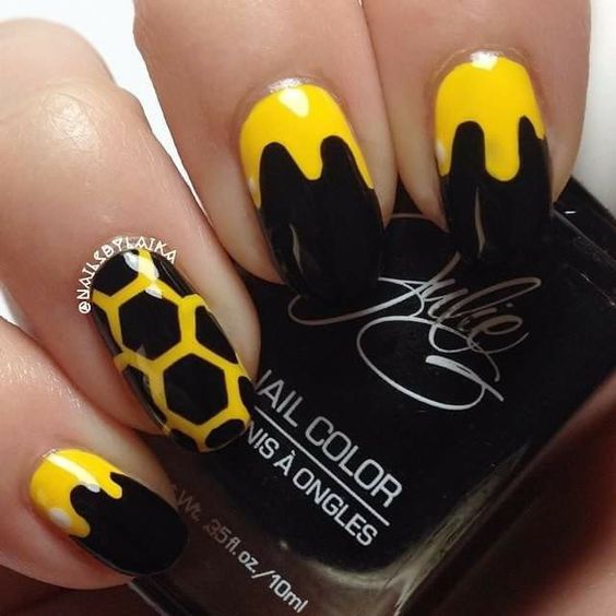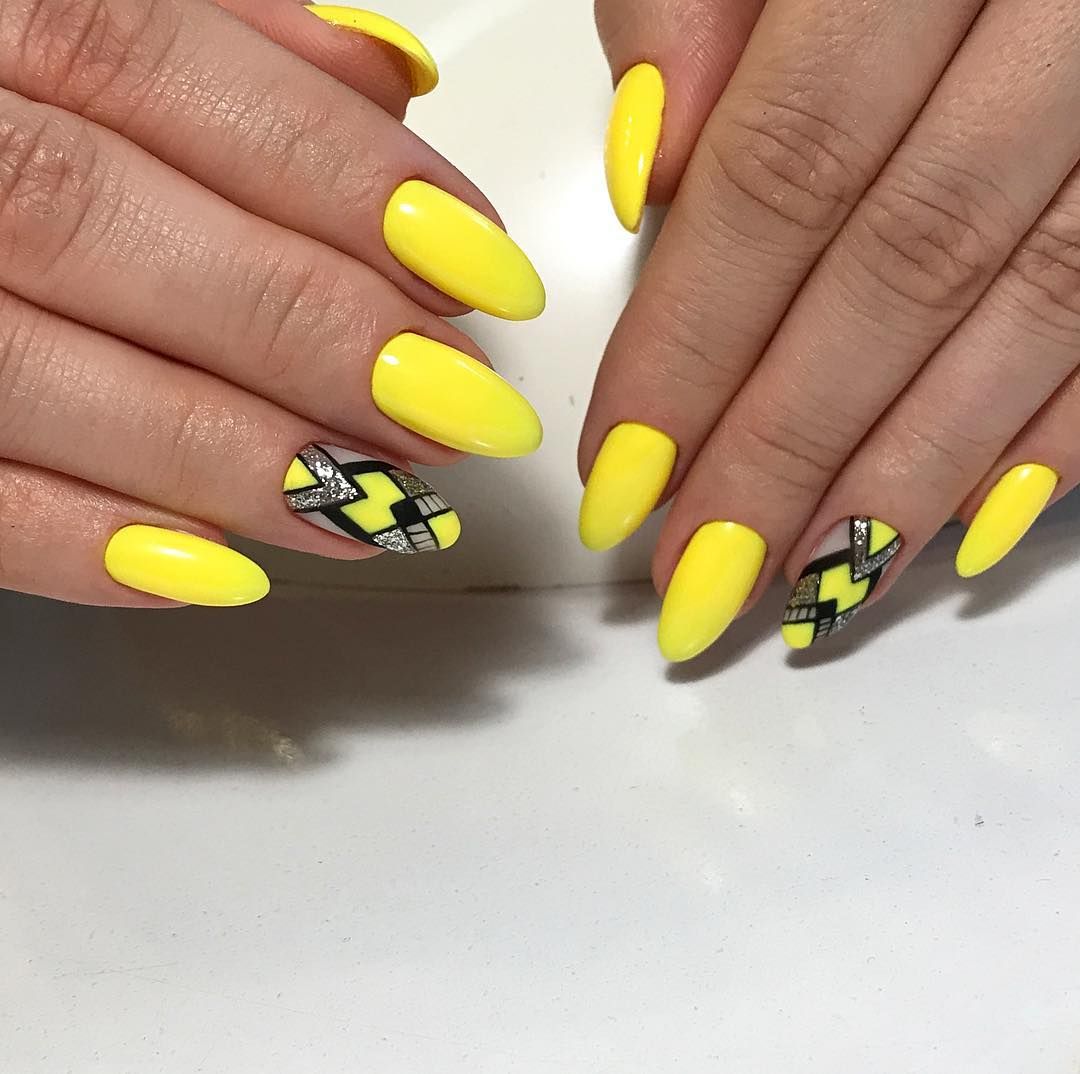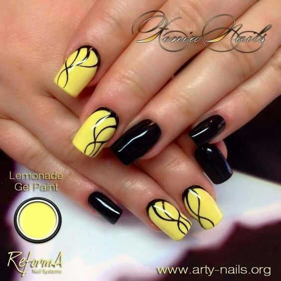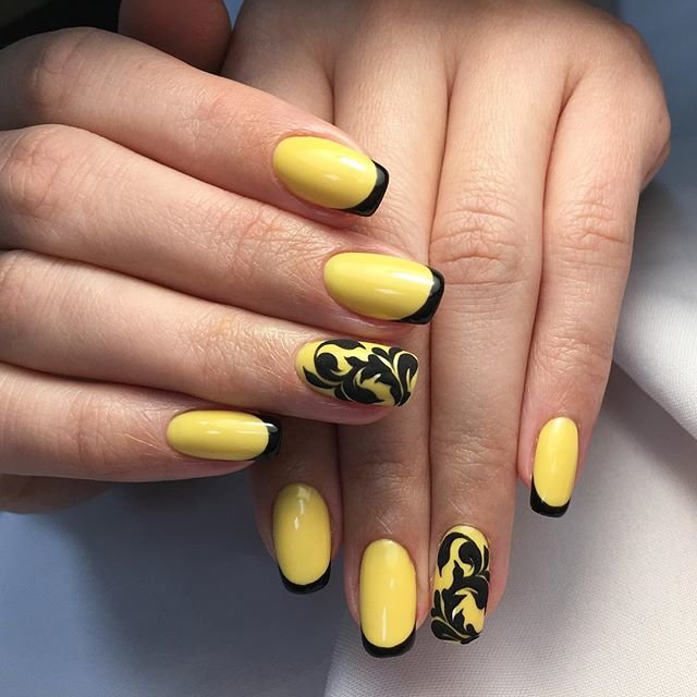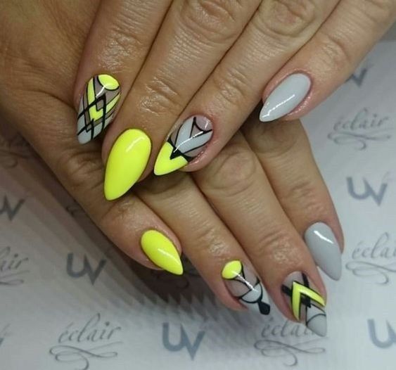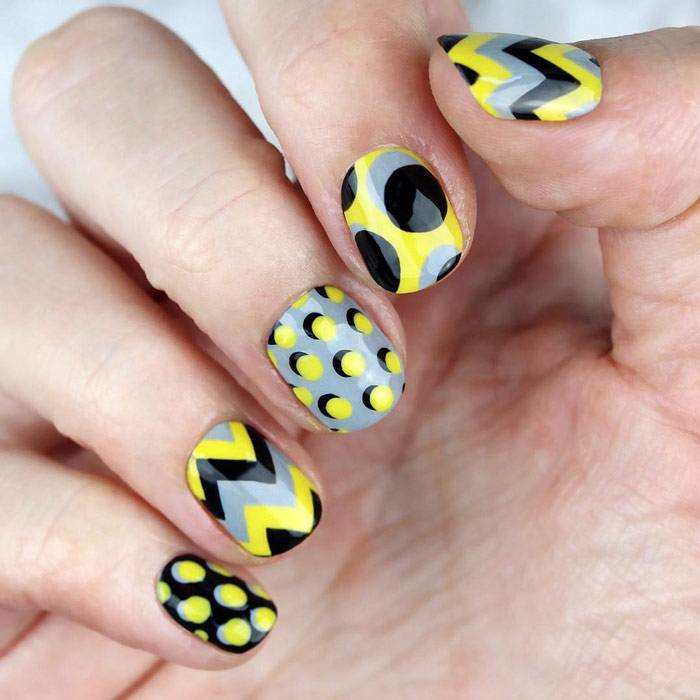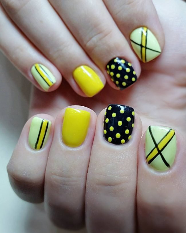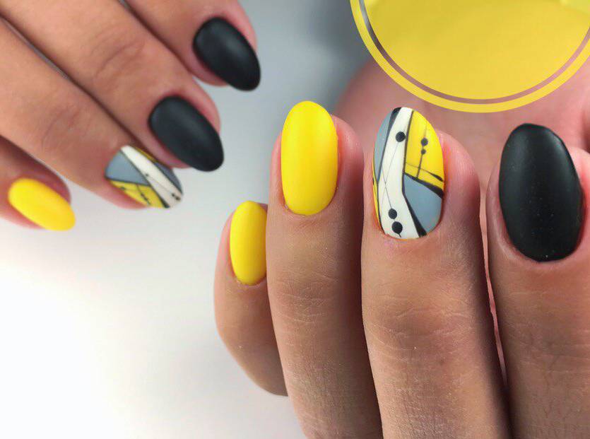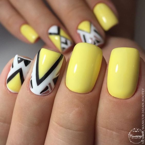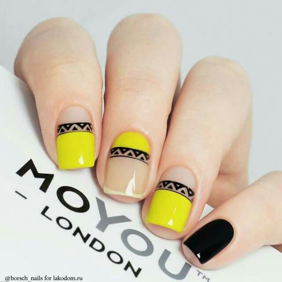 L'un des designs d'ongles modernes les plus en vogue reste la géométrie. Le motif géométrique en noir et jaune est éblouissant. Cela peut être un simple dessin utilisant des lignes ou un dessin complexe, avec l’application de carrés, de zigzags et de divers points. La combinaison de vernis noirs et jaunes avec d'autres couleurs peut ainsi dépasser toutes les attentes d'une manucure.