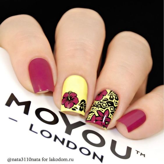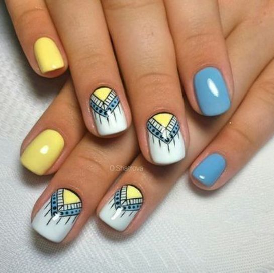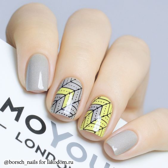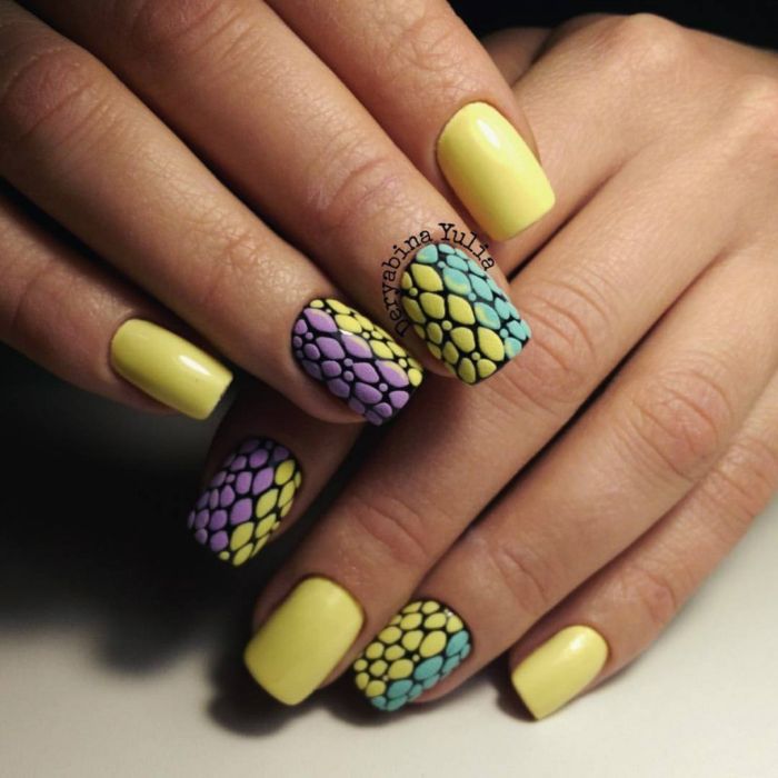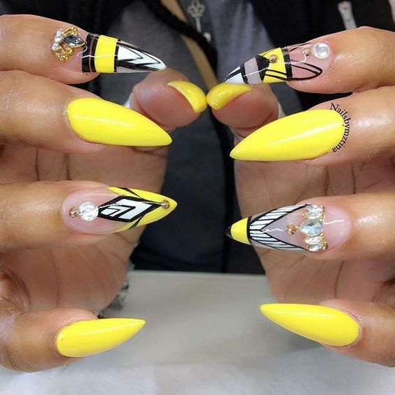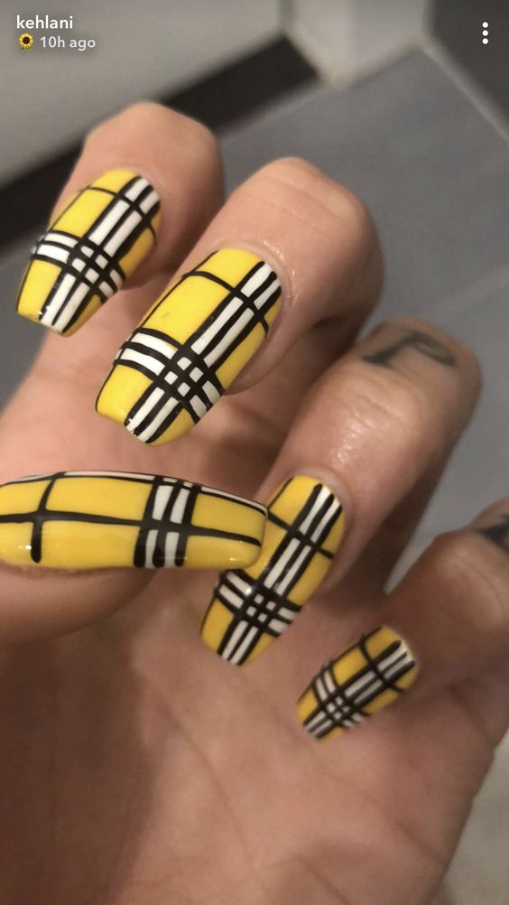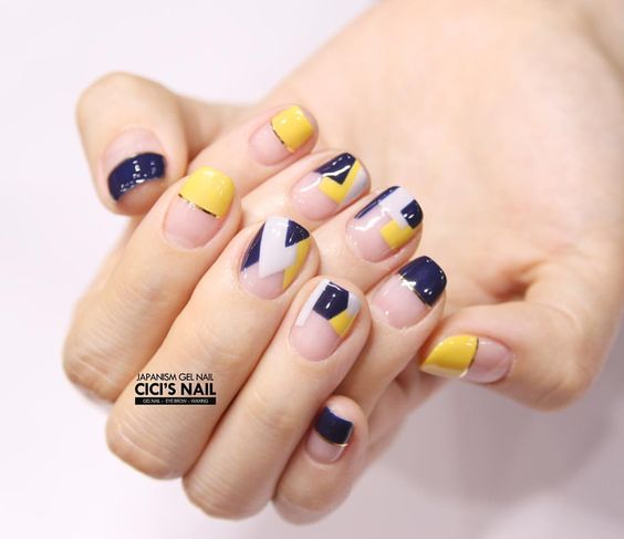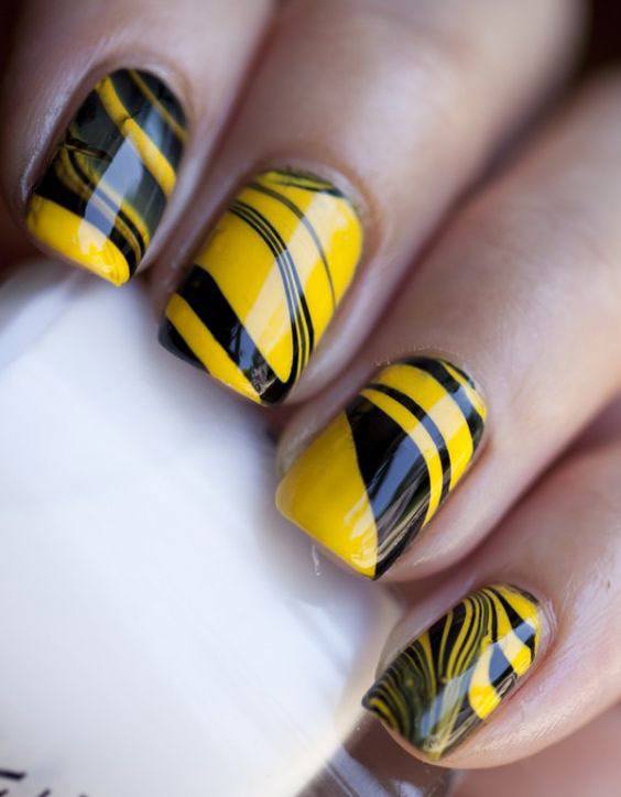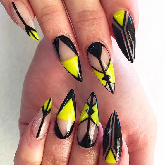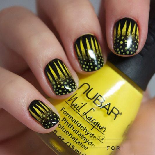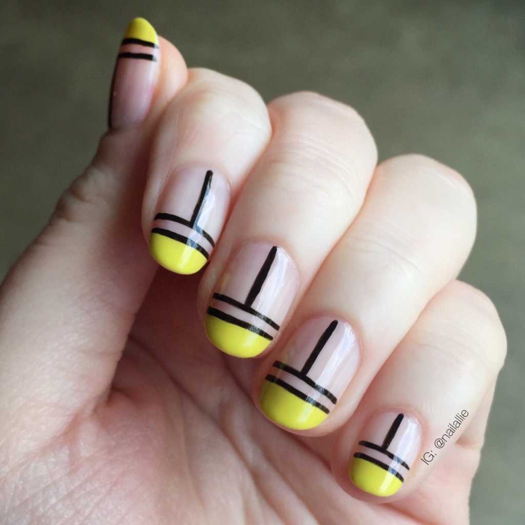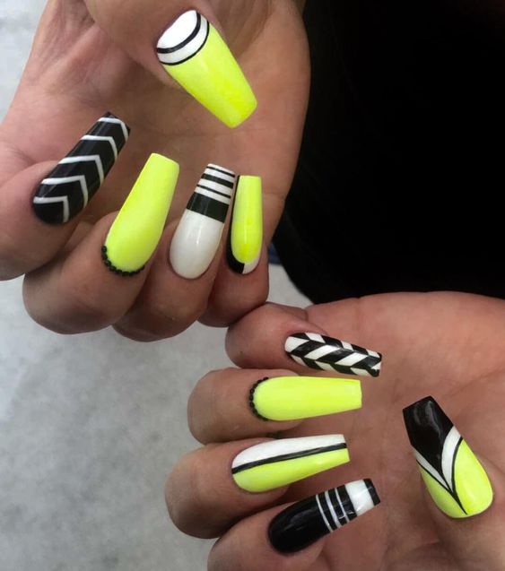 L'un des designs d'ongles modernes les plus en vogue reste la géométrie. Le motif géométrique en noir et jaune est éblouissant. Cela peut être un simple dessin utilisant des lignes ou un dessin complexe, avec l’application de carrés, de zigzags et de divers points. La combinaison de vernis noirs et jaunes avec d'autres couleurs peut ainsi dépasser toutes les attentes d'une manucure.