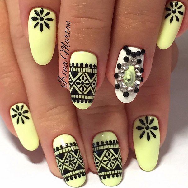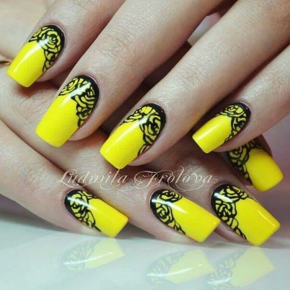 Vous planifiez une célébration et vous avez besoin d’une manucure festive en noir et jaune? Les concepteurs suggèrent d'utiliser des motifs complexes. Pour réaliser des dessins complexes en utilisant les deux couleurs principales, le noir et le jaune, les experts conseillent d'ajouter une autre nuance neutre. Il peut s'agir, par exemple, de vernis blanc. Si vous décidez de décorer vos ongles avec un beau motif en forme de fleurs, ajoutez du blanc au tandem noir et jaune.Ainsi, vous obtenez un dessin magnifique et volumineux. De tels motifs peuvent être appliqués à tous les ongles, ainsi qu'à un ou deux ongles.