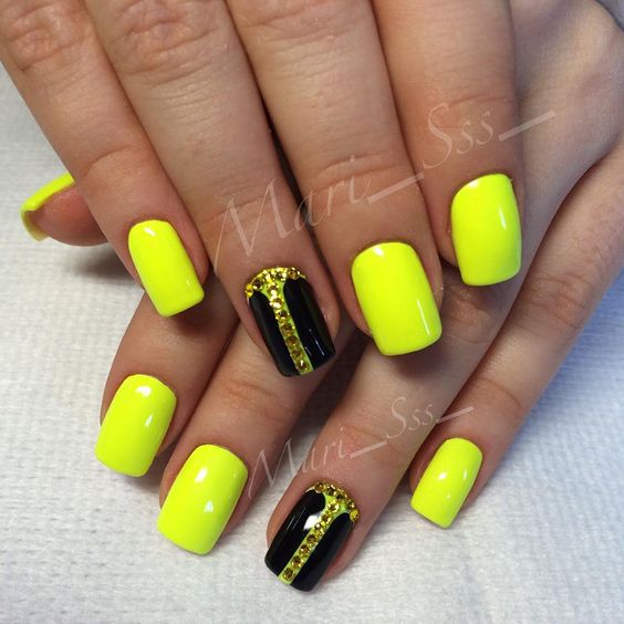 Pour assister à une fête ou à une fête, une manucure en noir et jaune est simplement nécessaire pour décorer avec des strass, des pierres ou des perles. La laque noire, si ce n'est plus, convient à la combinaison avec des strass, et le jaune met en valeur l’éclat des pierres. L'utilisation d'ajouts aussi brillants ajoutera un effet attrayant à votre manucure. Le plus important est de ne pas en faire trop avec le nombre d’éléments brillants. Pour que la conception des ongles soit élégante et belle, il est nécessaire d’observer la condition principale - la modération. Vous pouvez gâcher la photo en lui donnant un aspect lourd et négligé. Vos ongles auront un aspect festif et élégant si vous appliquez des strass ou des cailloux sur un ou deux ongles lors d’une manucure. L'option de manucure noire et jaune avec le remplissage continu d'un ongle entier avec des strass est magnifique. L'essentiel est que les strass soient de tailles différentes.