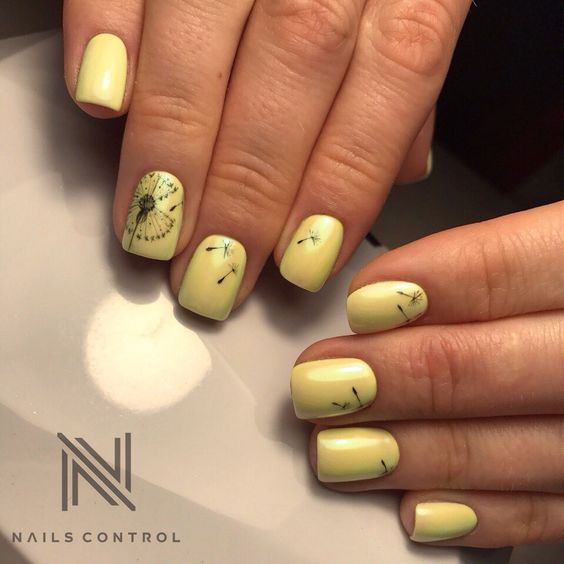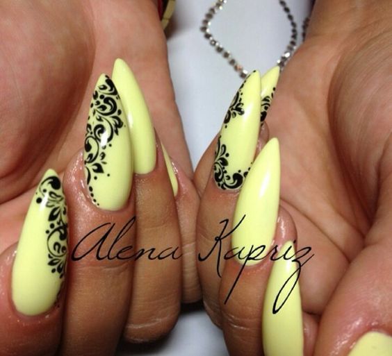 Manucure jaune avec un motif noir
