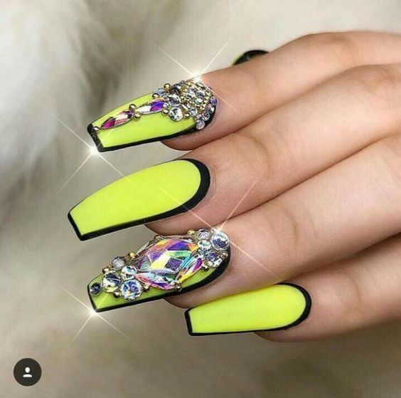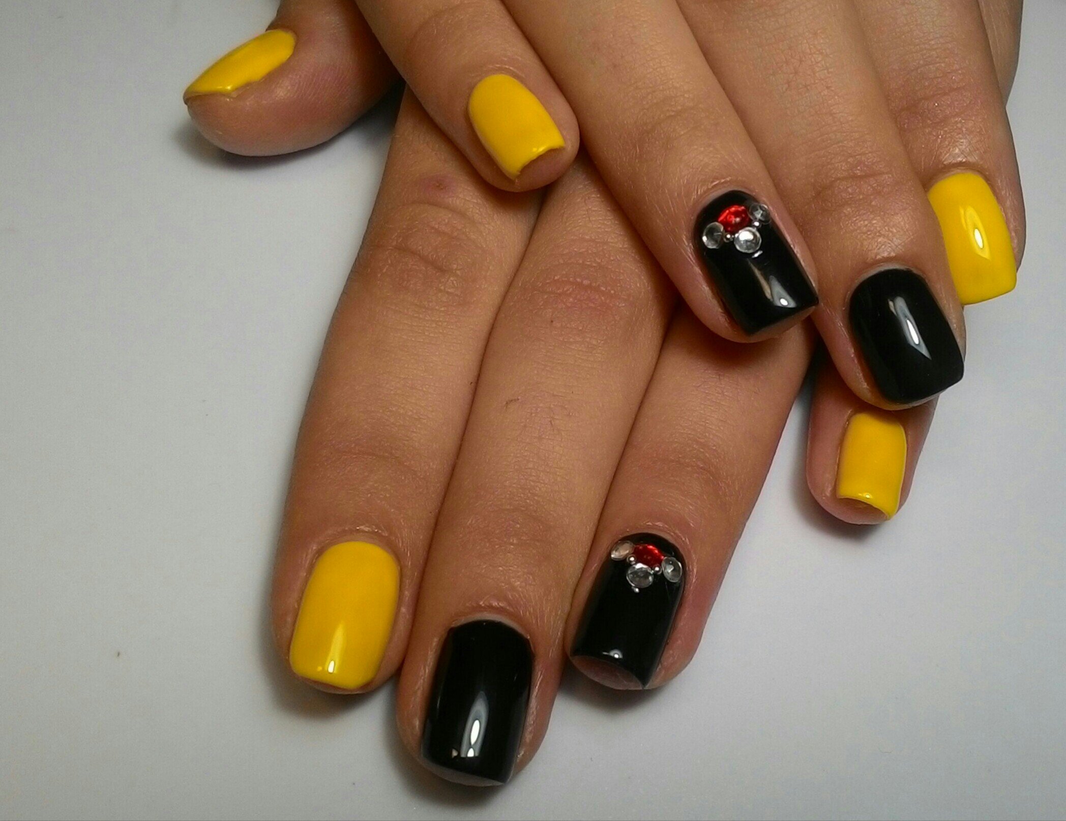 Manucure jaune-noir avec des strass