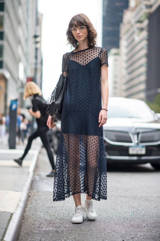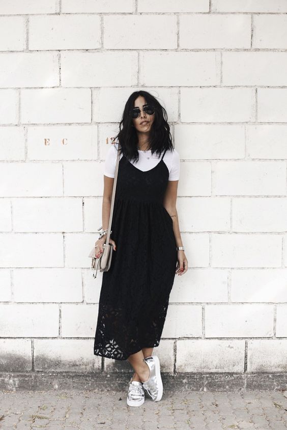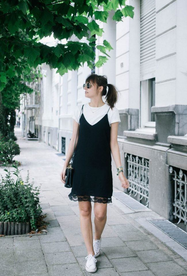 Il est à noter que c’est avec une robe noire que les baskets, les baskets et les slips sont très beaux. La plupart du temps, ils sont choisis en blanc, car ils sont parfaits pour tous les looks. Mais si vous le souhaitez, vous pouvez acheter des produits bicolores qui rendront tout archet encore plus attrayant.