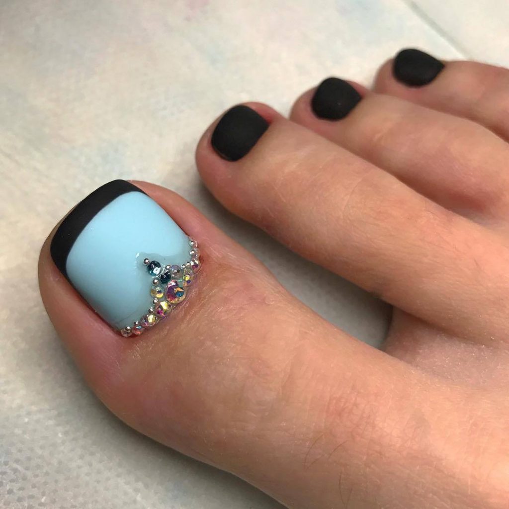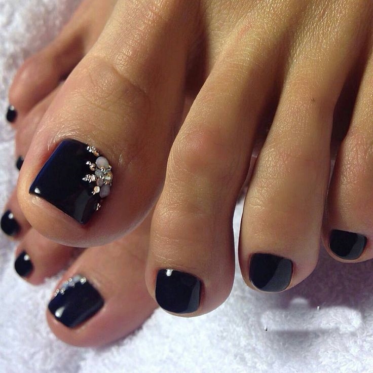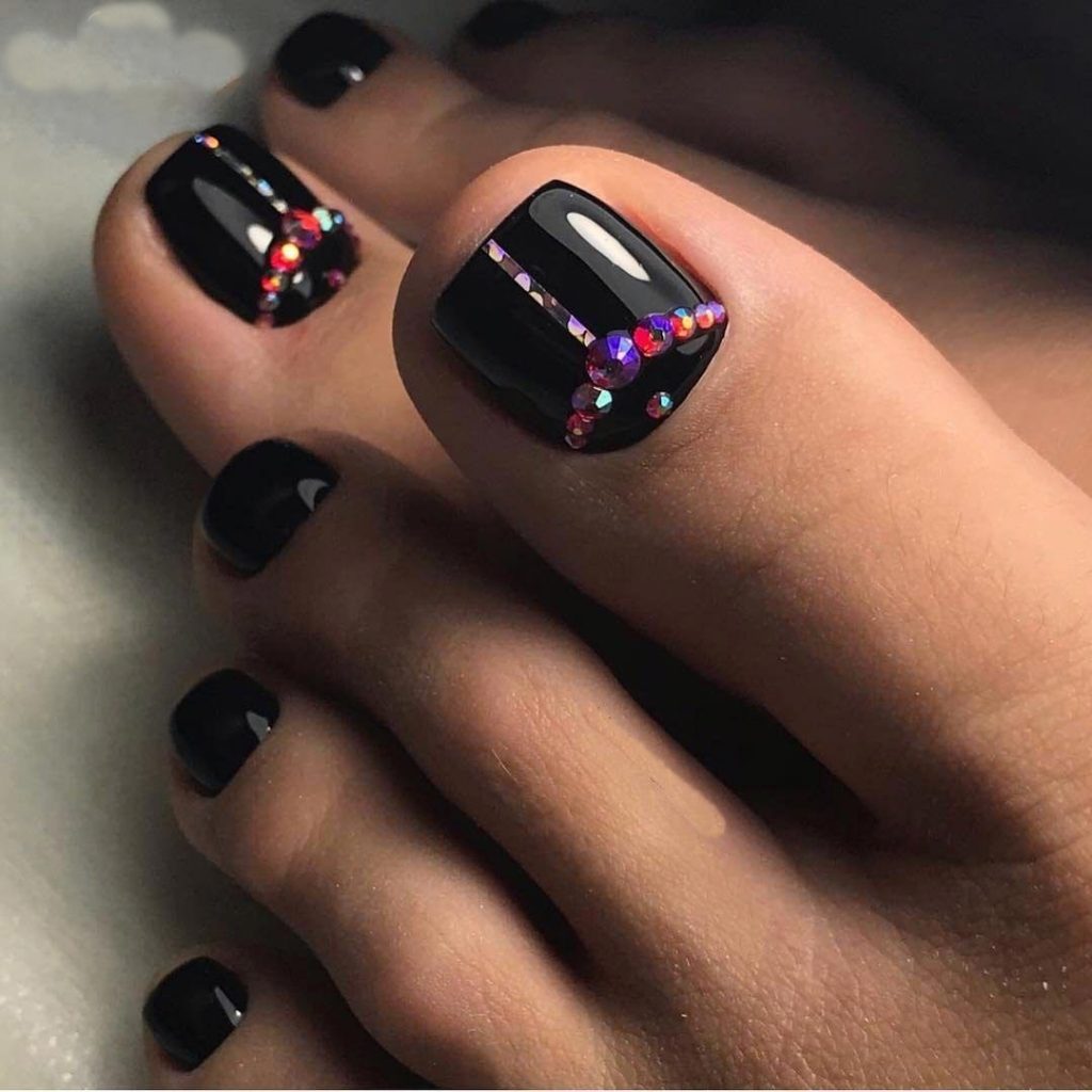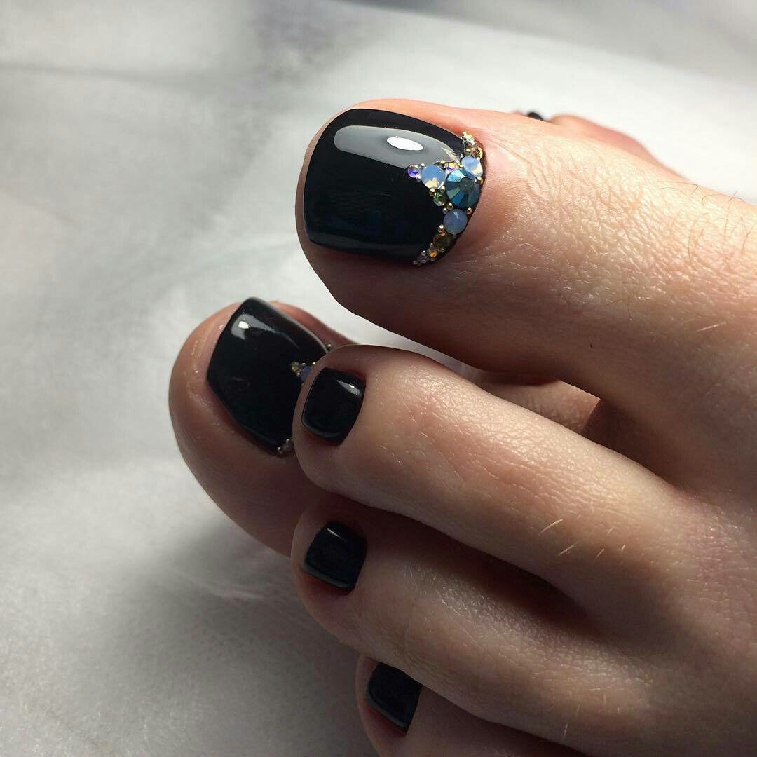 Les strass sont l'option la plus originale et la plus polyvalente pour effectuer une pédicure noire. En effet, à partir de cailloux irisés, vous pouvez réaliser une grande variété d’ornements. Par exemple, l'ongle de l'index peut être complètement disposé avec des strass scintillants. Lorsqu'ils sont exposés au soleil, ils trahiront une brillance qui attirera l'attention des autres. Également avec des strass, vous pouvez faire des rayures et des trous brillants.