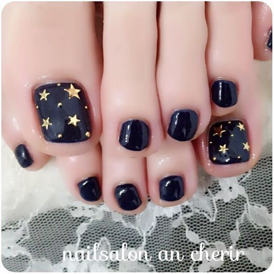 La pédicure noire donne une excellente occasion de réaliser divers types de design sur son fond. De plus, la teinte sombre est en mesure de mettre en valeur tous les éléments nécessaires des ornements. Une conception peut être des autocollants, des cellules peintes, des points, des motifs, des cubes. Il convient de rappeler qu'un grand nombre de combinaisons de couleurs peuvent complètement gâcher une pédicure et lui donner un aspect économique. Les rubans en or peuvent être utilisés pour le vernis noir, car l'or a toujours été et sera à la mode. Dans certains cas, les maîtres de pédicure recouvrent les ongles avec une finition mate, ce qui confère un certain mystère aux doigts des femmes.