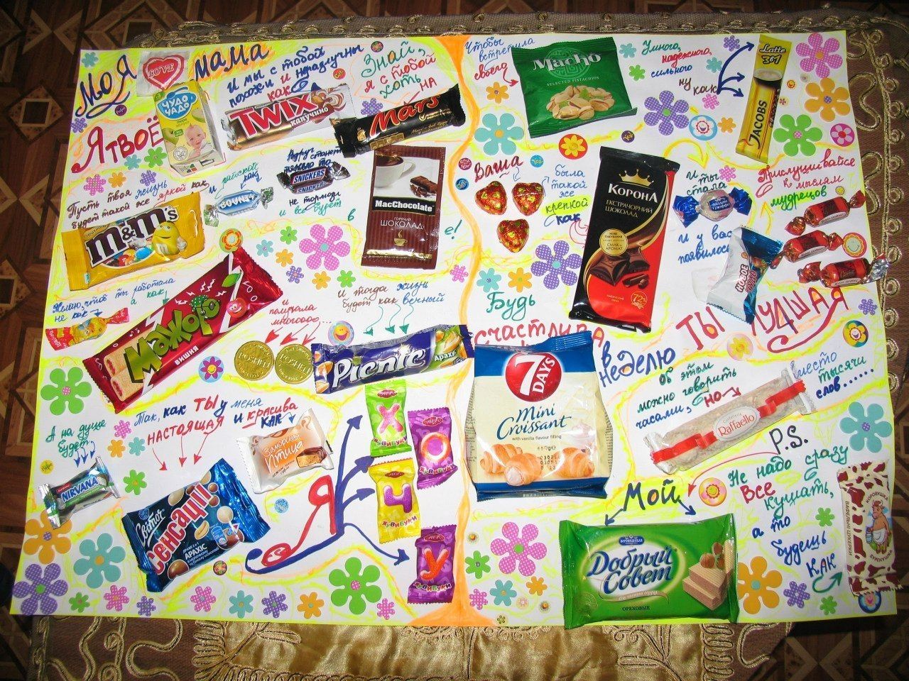 Un tel cadeau original fera sûrement fondre le cœur de chaque maman. Pour faire un cadeau, nous avons besoin d’un papier Whatman, de marqueurs multicolores, de tablettes de chocolat (Miracle, Bounty, Mars, Twix, chewing-gum menthe poivrée, Kinder), d’un pistolet à colle ou de la super colle transparente. Au centre de l'affiche, écrivez le titre en lettres capitales: "Maman, joyeux anniversaire." Maintenant, placez les bonbons dans un ordre aléatoire sur le papier whatman, collez-les avec de la colle et écrivez de jolis mots à côté, par exemple: comme c'est cool que je sois à vous (gentil), nous en avons juste un (barre miracle). Le lettrage peut être inventé par vous-même. Une affiche toute faite devrait être placée le matin dans la cuisine, créant ainsi une surprise inattendue pour maman le jour de son anniversaire. Une telle félicitation encouragera certainement la fille anniversaire pour toute la journée.