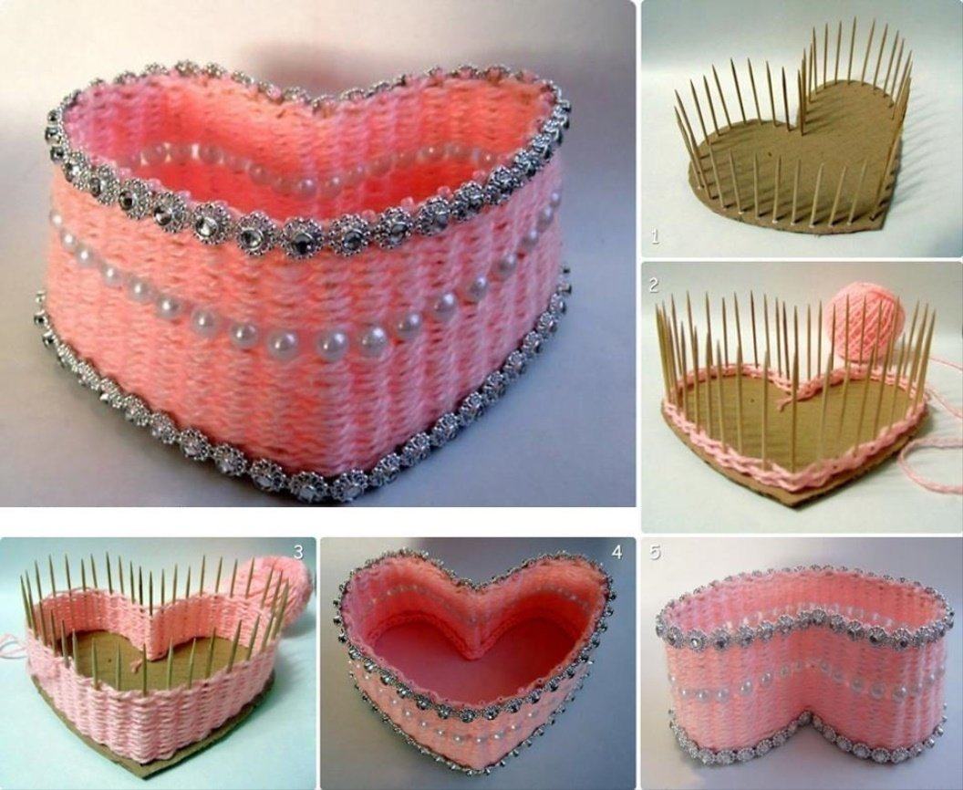 Sur un carton épais, dessinez et découpez un beau coeur. Maintenant, faites tout autour du périmètre, faites de petits trous avec un poinçon et installez-y des cure-dents. Lubrifiez les cure-dents avec de la colle pour plus de fiabilité. Prenez des fils de laine de toutes les couleurs et enroulez un serpent autour des cure-dents sur tout le périmètre de la future boîte. Pour rendre la boîte encore plus belle en atteignant le milieu, placez une perle sur chaque cure-dent et continuez de l’envelopper. À la fin, assurez-vous de fixer le fil avec de la colle. Collez un beau ruban en haut et en bas de notre cercueil.