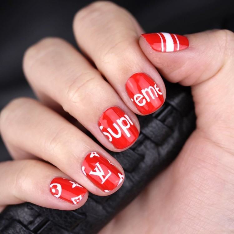 Il existe des cas où la direction exige une manucure professionnelle de la part de ses subordonnées sous les couleurs de la marque ou avec les symboles de la société elle-même. Et la tendance de la mode sous la forme de manucure avec des logos de marques célèbres gagne en popularité, comme le prouvent des exemples frappants des fashionistas les plus élégantes d’INSTAGRAM.