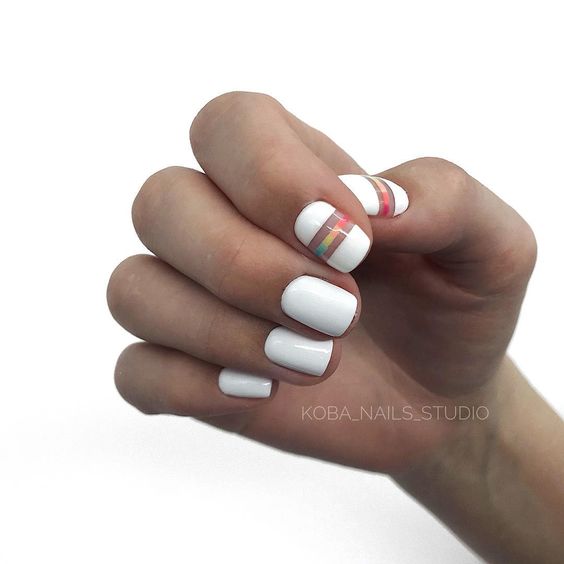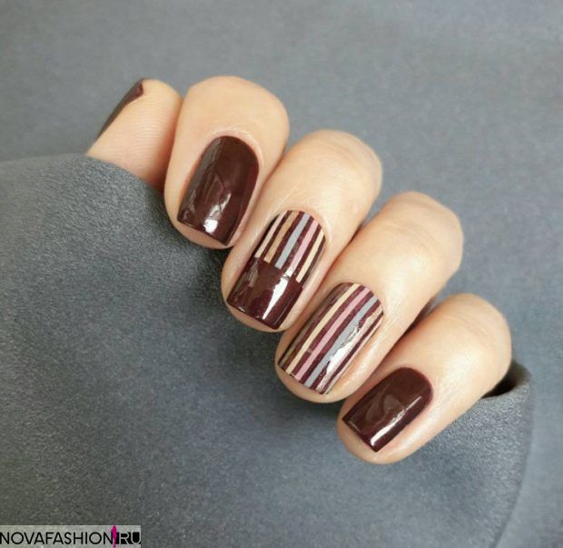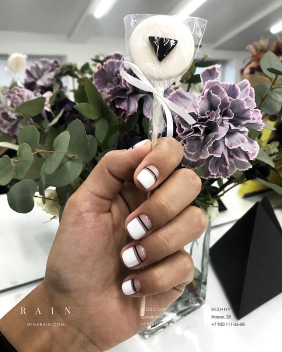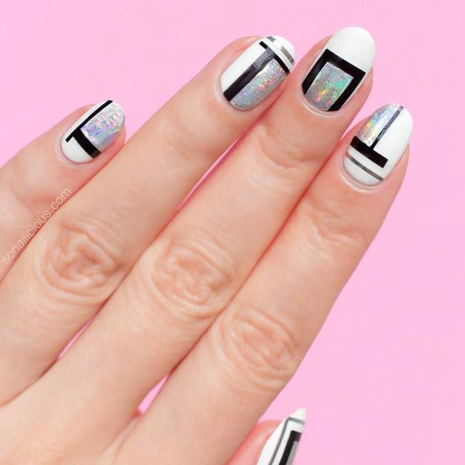 La manucure géométrique Shellac est une option idéale pour les manucures de bureau. Ce look est l’un des designs les plus recherchés et les plus stylés de cette année. Sur les ongles, vous pouvez représenter des losanges, des triangles, des pois, une cage et également diviser l’ongle en segments même ou complètement différents. Vous pouvez faire des lignes droites et ondulées en les plaçant horizontalement, verticalement ou en diagonale. Chaque élément se distingue par la gomme laque d'une certaine couleur ou structure. En ajoutant un ruban spécial à la manucure géométrique, vous améliorerez non seulement la précision des lignes, mais vous leur donnerez également un accent brillant.
