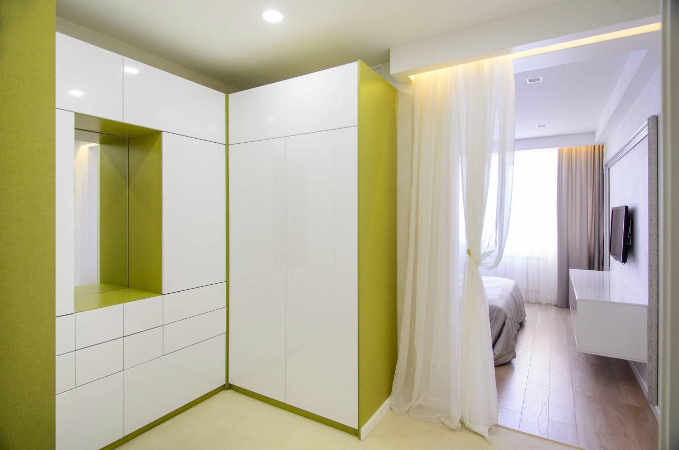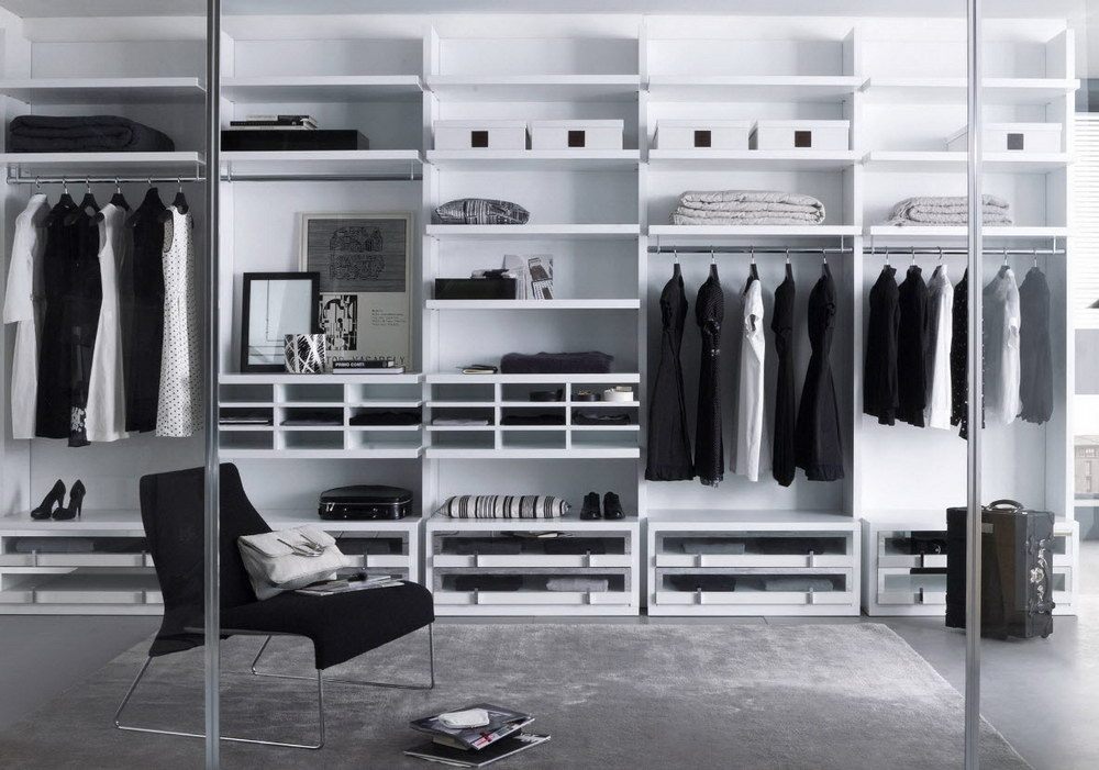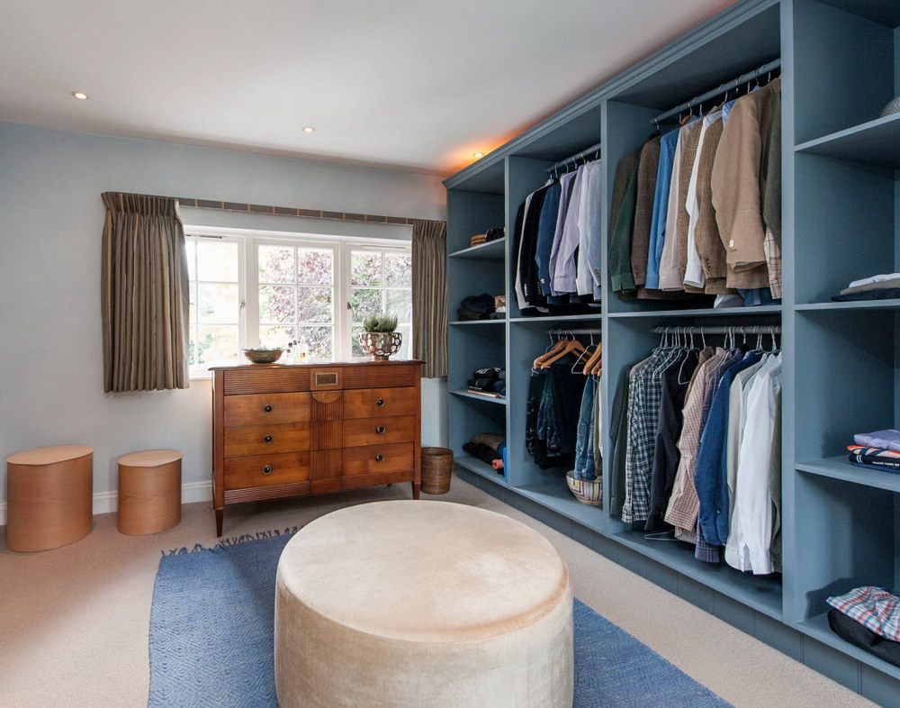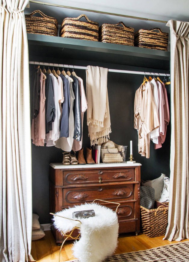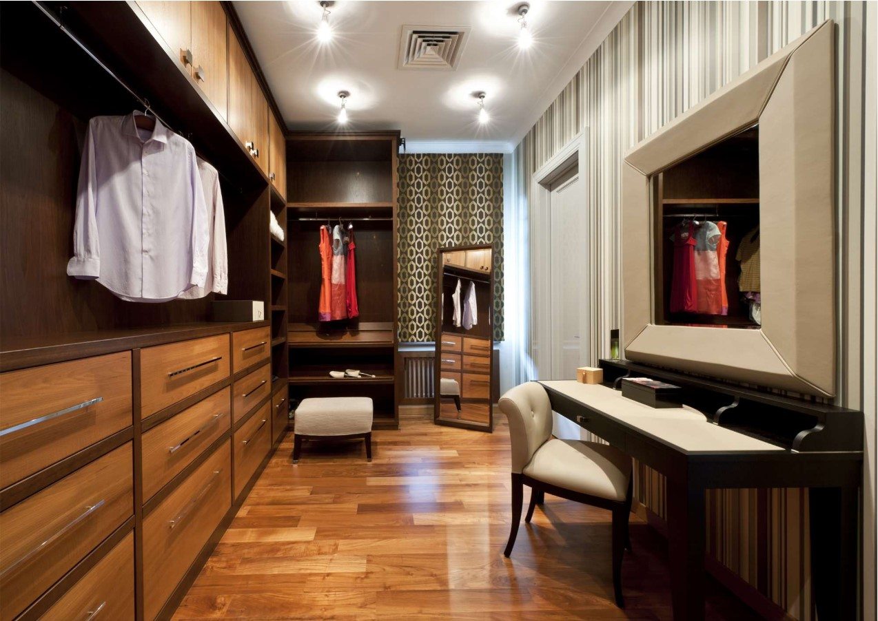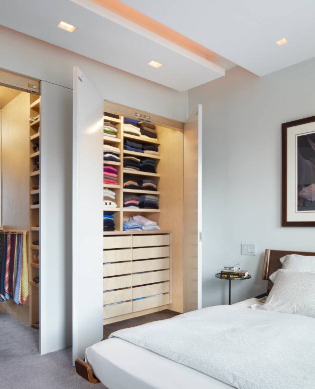 Dans la maison où le dressing n’était pas conçu à l’origine, il est plus facile de l’équiper dans la chambre à coucher. Pour ce faire, un petit espace est séparé par un mur ou des portes coulissantes. Même une étagère avec couloir ou une armoire haute peuvent assumer ce rôle.