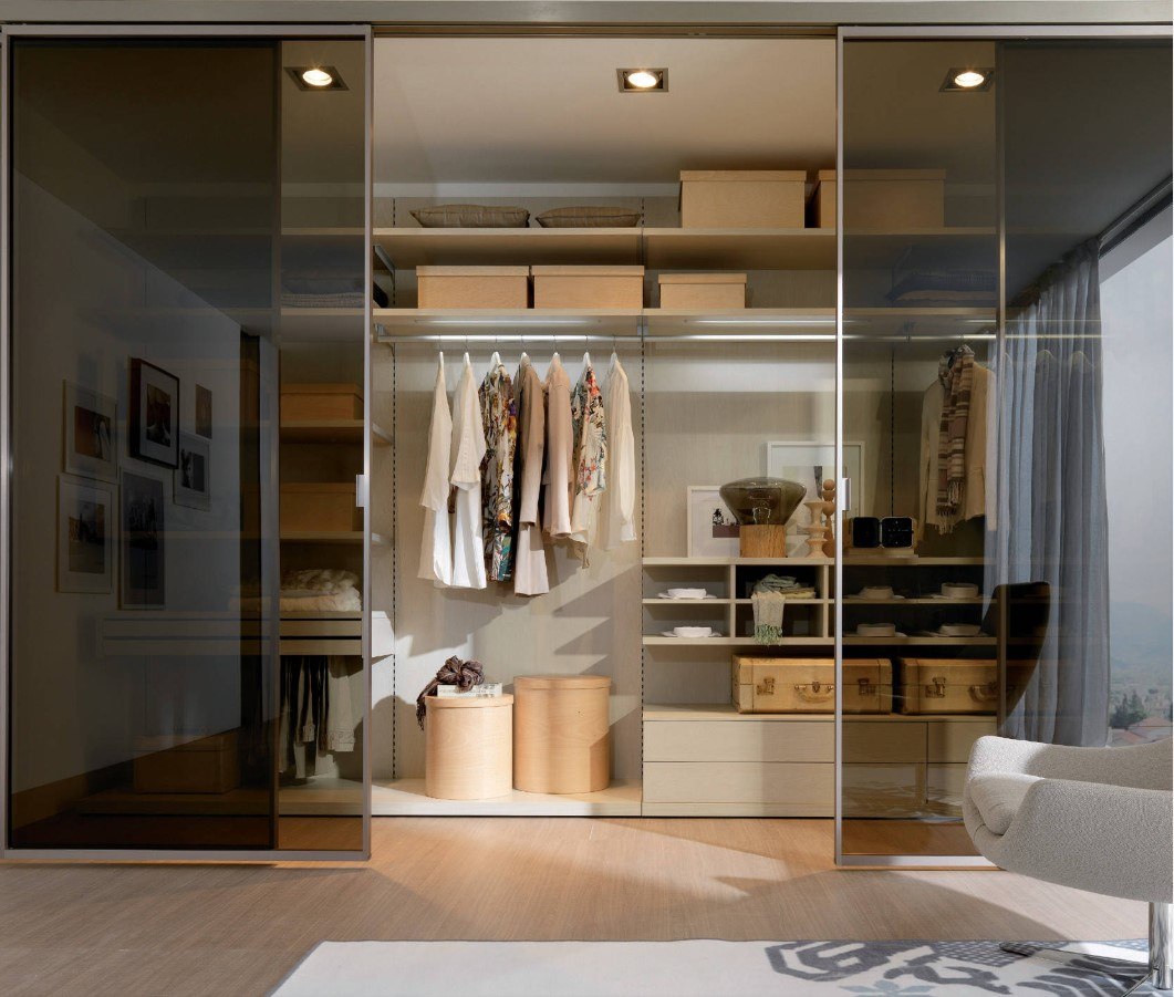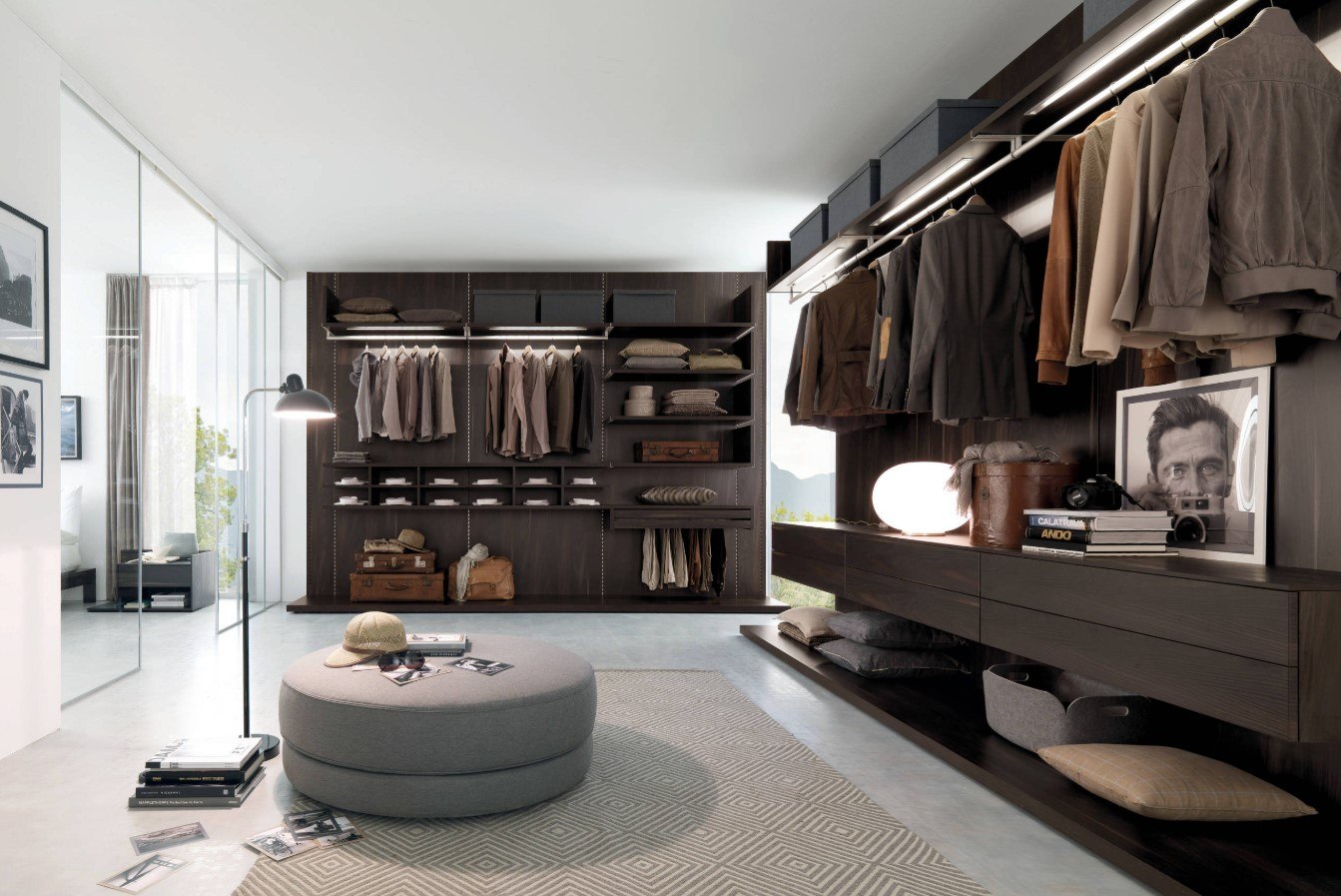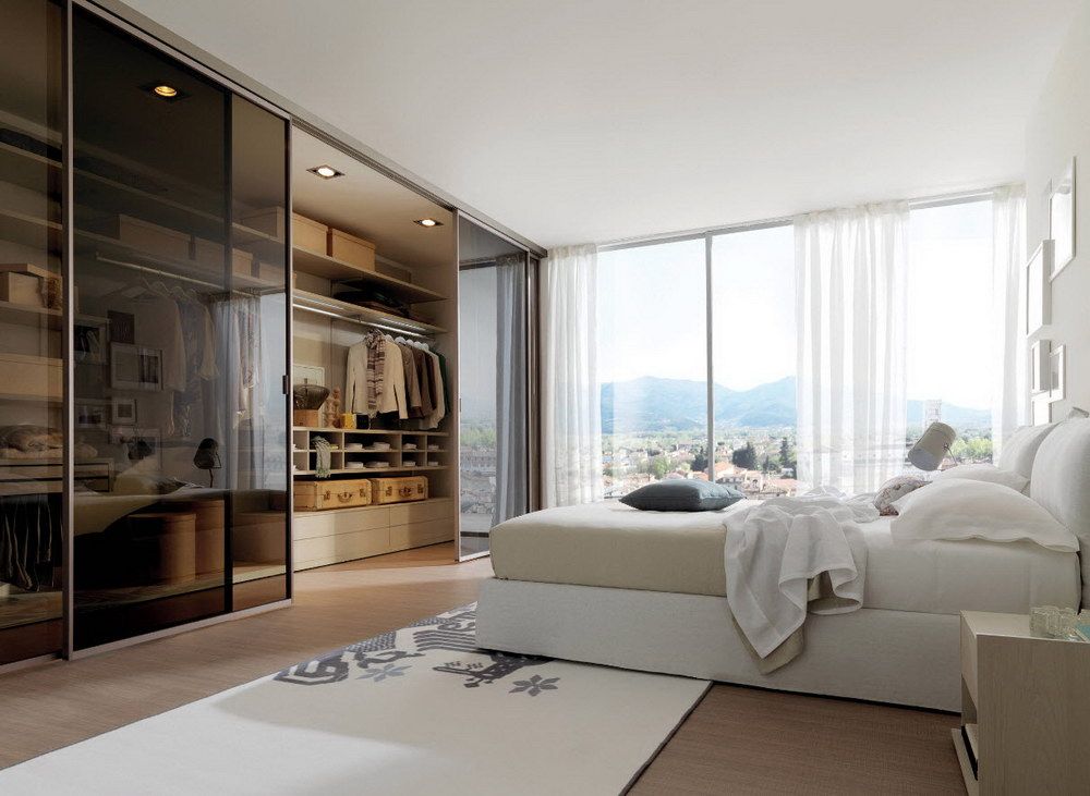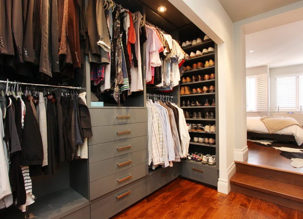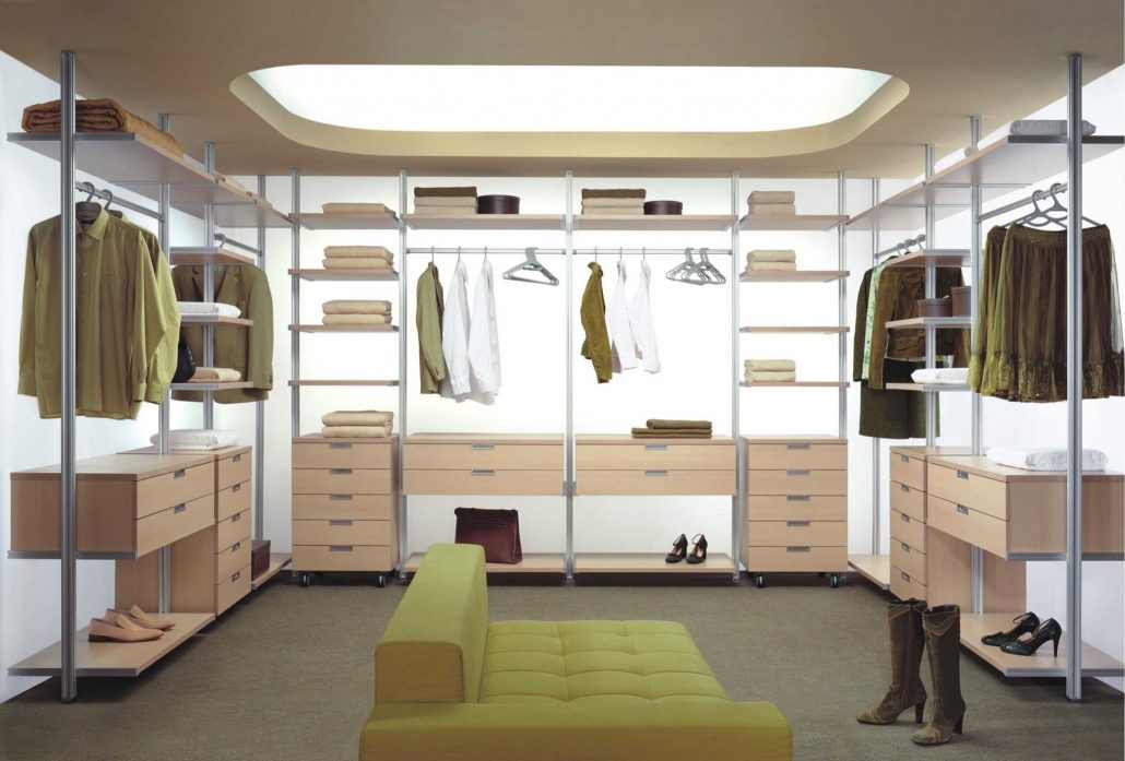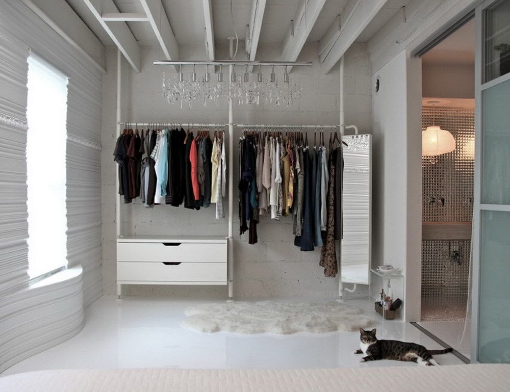 Dans la maison où le dressing n’était pas conçu à l’origine, il est plus facile de l’équiper dans la chambre à coucher. Pour ce faire, un petit espace est séparé par un mur ou des portes coulissantes. Même une étagère avec couloir ou une armoire haute peuvent assumer ce rôle.