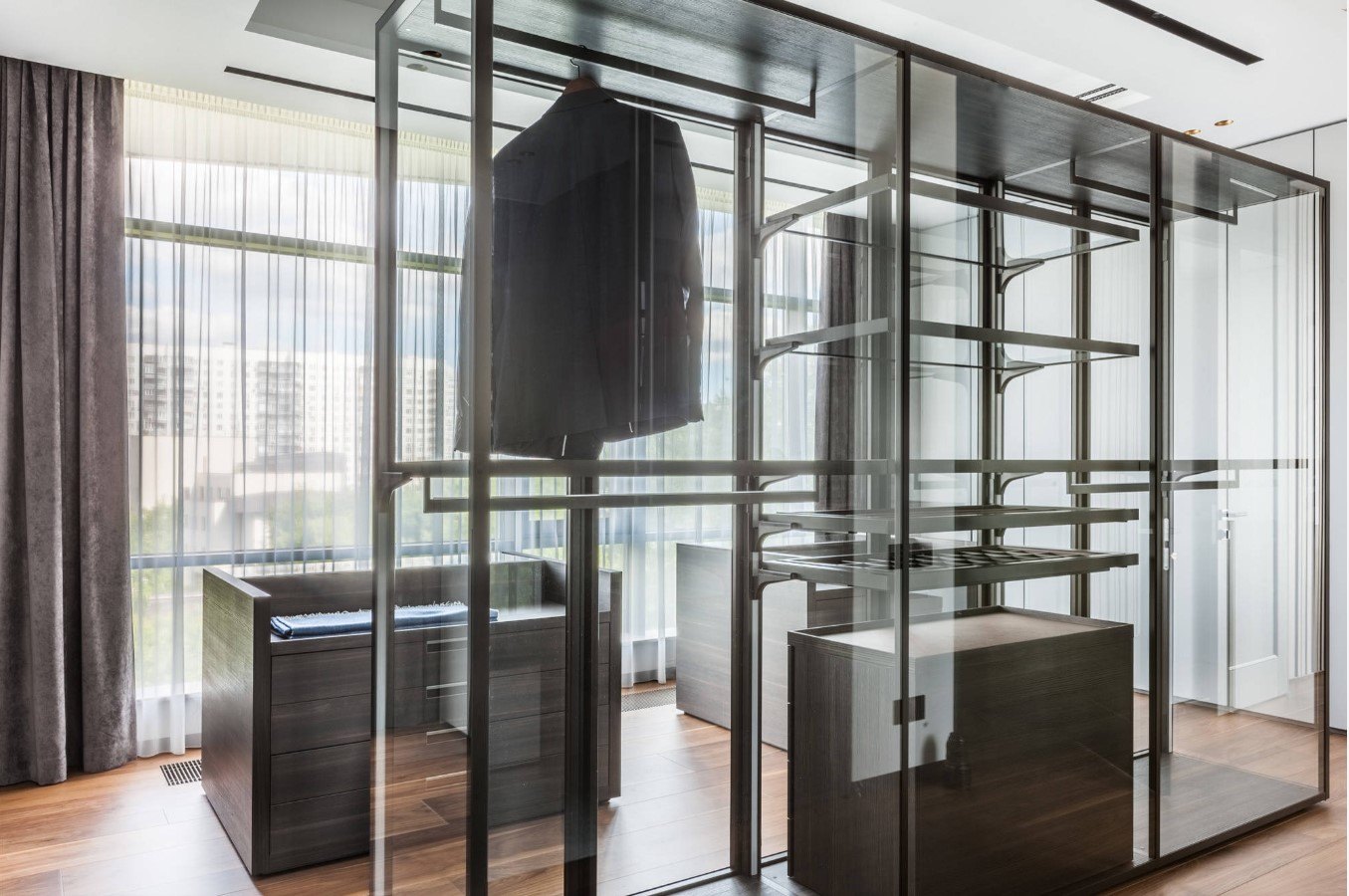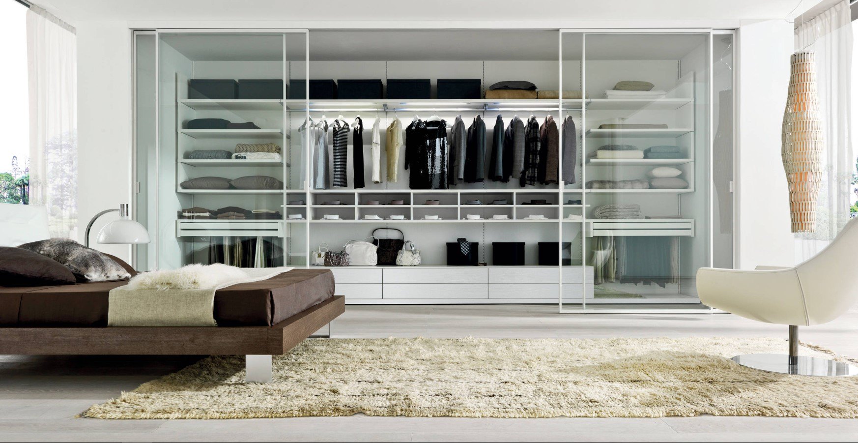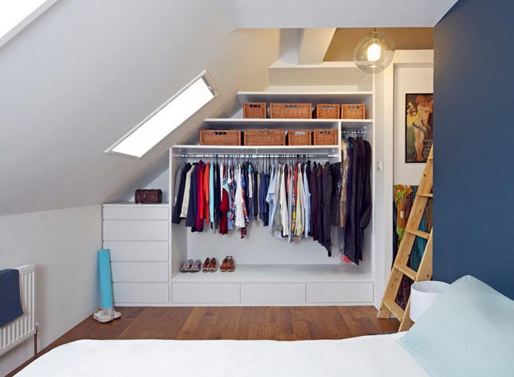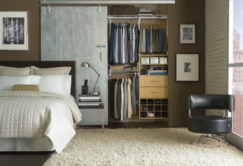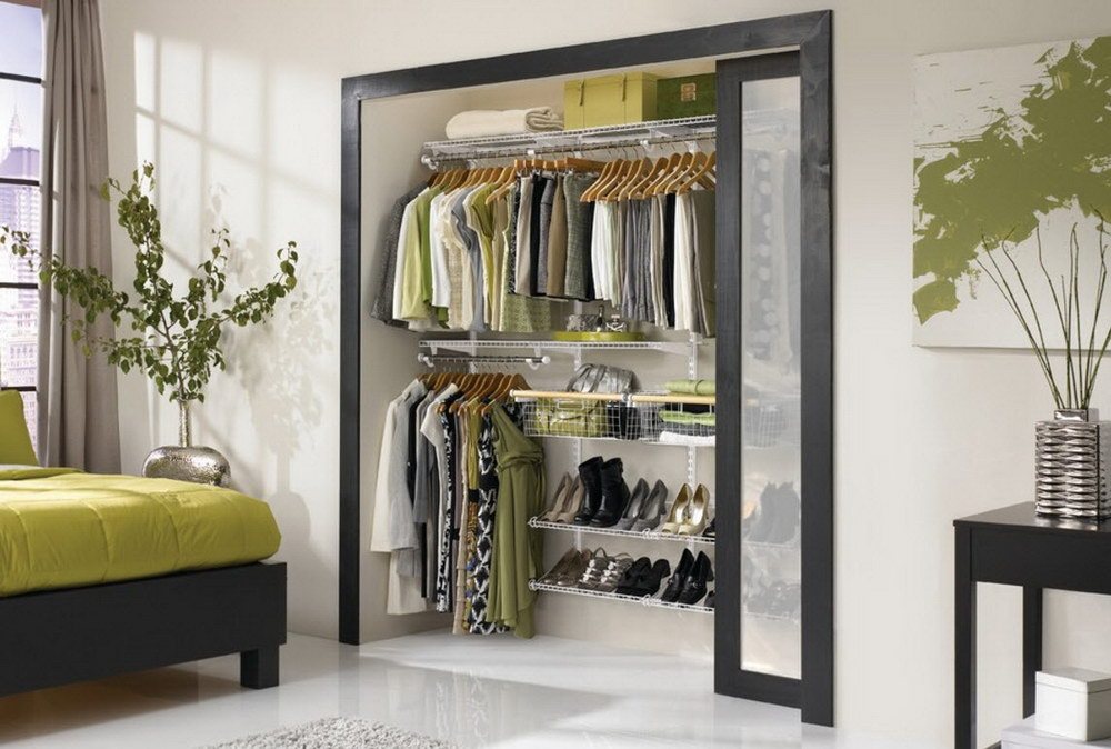 Dans la maison où le dressing n’était pas conçu à l’origine, il est plus facile de l’équiper dans la chambre à coucher. Pour ce faire, un petit espace est séparé par un mur ou des portes coulissantes. Même une étagère avec couloir ou une armoire haute peuvent assumer ce rôle.