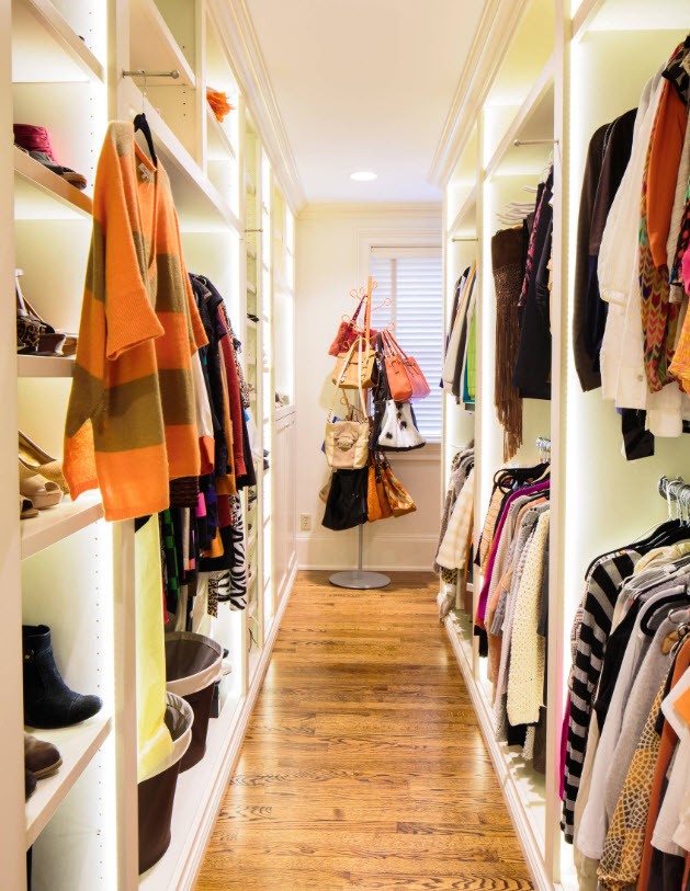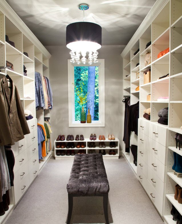 Cette option peut être utilisée dans un long couloir, où une fenêtre ou un grand miroir est situé en face de la porte. En même temps, les cintres et les étagères seront opposés le long des murs. La capacité d'un tel dressing est énorme. De plus, étant donné que tout est visible, son accès n’est pas difficile. S'il y a une porte dans un tel couloir, alors la question de la création d'un éclairage et d'une ventilation spéciaux est résolue par elle-même.