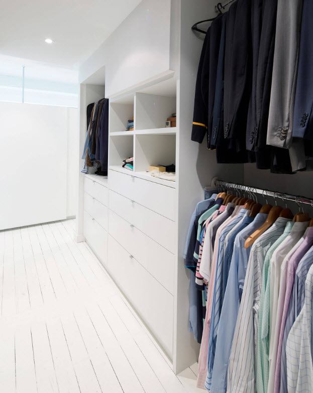 Un tel dressing peut être placé dans des pièces de petite superficie. Grâce au placement perpendiculaire des systèmes de stockage, vous pouvez stocker deux fois plus d'objets que dans une armoire classique.Les portes coulissantes sont utilisées pour séparer le dressing. Si la pièce a une hauteur importante, il est permis d’utiliser des écrans, des rideaux ou des cloisons avec une ouverture pour une porte en contreplaqué ou en gypse.